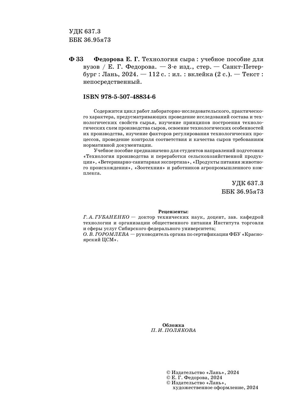 Содержится цикл работ лабораторно-исследовательского, практического характера, предусматривающих проведение исследований состава и технологических свойств сырья, изучение принципов построения технологических схем производства сыров, освоение технологических особенностей их производства, изучение факторов регулирования технологических процессов, проведение контроля соответствия и качества сыров требованиям нормативной документации. Учебное пособие предназначено для студентов направлений подготовки «Технология производства и переработки сельскохозяйственной продукции», «Ветеринарно-санитарная экспертиза», «Продукты питания животного происхождения», «Зоотехния» и работников агропромышленного комплекса.