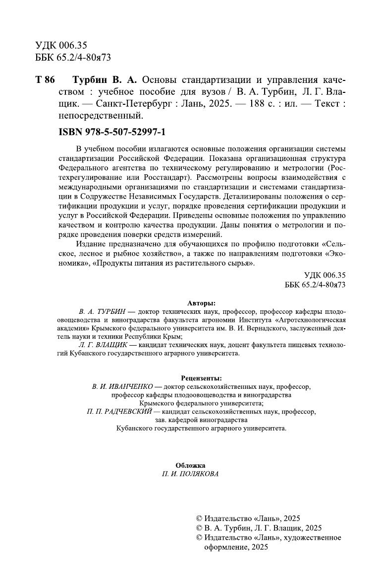 В учебном пособии излагаются основные положения организации системы стандартизации Российской Федерации. Показана организационная структура Федерального агентства по техническому регулированию и метрологии (Ростехрегулирование или Росстандарт). Рассмотрены вопросы взаимодействия с международными организациями по стандартизации и системами стандартизации в Содружестве Независимых Государств. Детализированы положения о сертификации продукции и услуг, порядке проведения сертификации продукции и услуг в Российской Федерации. Приведены основные положения по управлению качеством и контролю качества продукции. Даны понятия о метрологии и порядке проведения поверки средств измерений. Издание предназначено для обучающихся по профилю подготовки «Сельское, лесное и рыбное хозяйство», а также по направлениям подготовки «Экономика», «Продукты питания из растительного сырья».