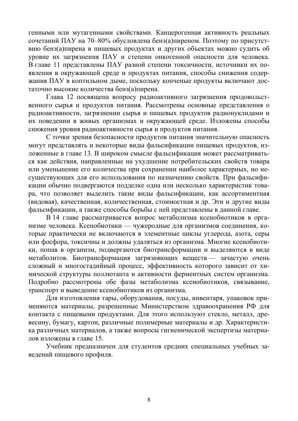 В учебнике рассмотрены основные понятия безопасности, основополагающие законы РФ в области безопасности и качества пищевых продуктов, опасности, обусловленные алиментарными, условно неалиментарными и токсическими соединениями природного происхождения, деятельностью микроорганизмов и микроскопических грибов, проблемы, связанные с использованием пищевых и биологически активных добавок, созданием трансгенных продуктов питания, фальсификацией пищевых продуктов, загрязнением продовольственного сырья и продуктов питания веществами, применяемыми в сельском хозяйстве, загрязнением токсичными элементами, диоксинами и диоксиноподобными соединениями, полициклическими ароматическими углеводородами, радионуклидами, представлен метаболизм ксенобиотиков в организме, а также гигиеническая экспертиза материалов, контактирующих с пищевыми продуктами. Соответствует современным требованиям Федерального государственного образовательного стандарта среднего профессионального образования и профессиональным квалификационным требованиям. Учебник предназначен для студентов средних специальных учебных заведений.