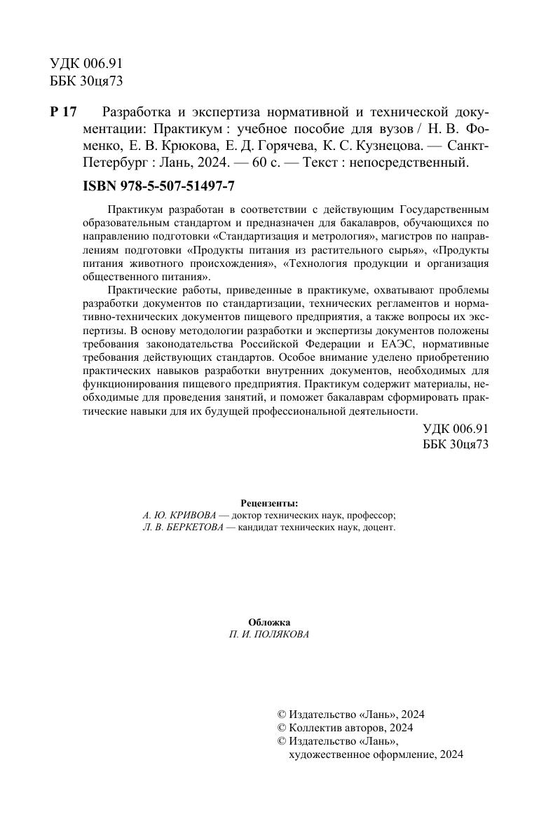 Практикум разработан в соответствии с действующим Государственным образовательным стандартом и предназначен для бакалавров, обучающихся по направлению подготовки «Стандартизация и метрология», магистров по направлениям подготовки «Продукты питания из растительного сырья», «Продукты питания животного происхождения», «Технология продукции и организация общественного питания». Практические работы, приведенные в практикуме, охватывают проблемы разработки документов по стандартизации, технических регламентов и нормативно-технических документов пищевого предприятия, а также вопросы их экспертизы. В основу методологии разработки и экспертизы документов положены требования законодательства Российской Федерации и ЕАЭС, нормативные требования действующих стандартов. Особое внимание уделено приобретению практических навыков разработки внутренних документов, необходимых для функционирования пищевого предприятия. Практикум содержит материалы, необходимые для проведения занятий, и поможет бакалаврам сформировать практические навыки для их будущей профессиональной деятельности.