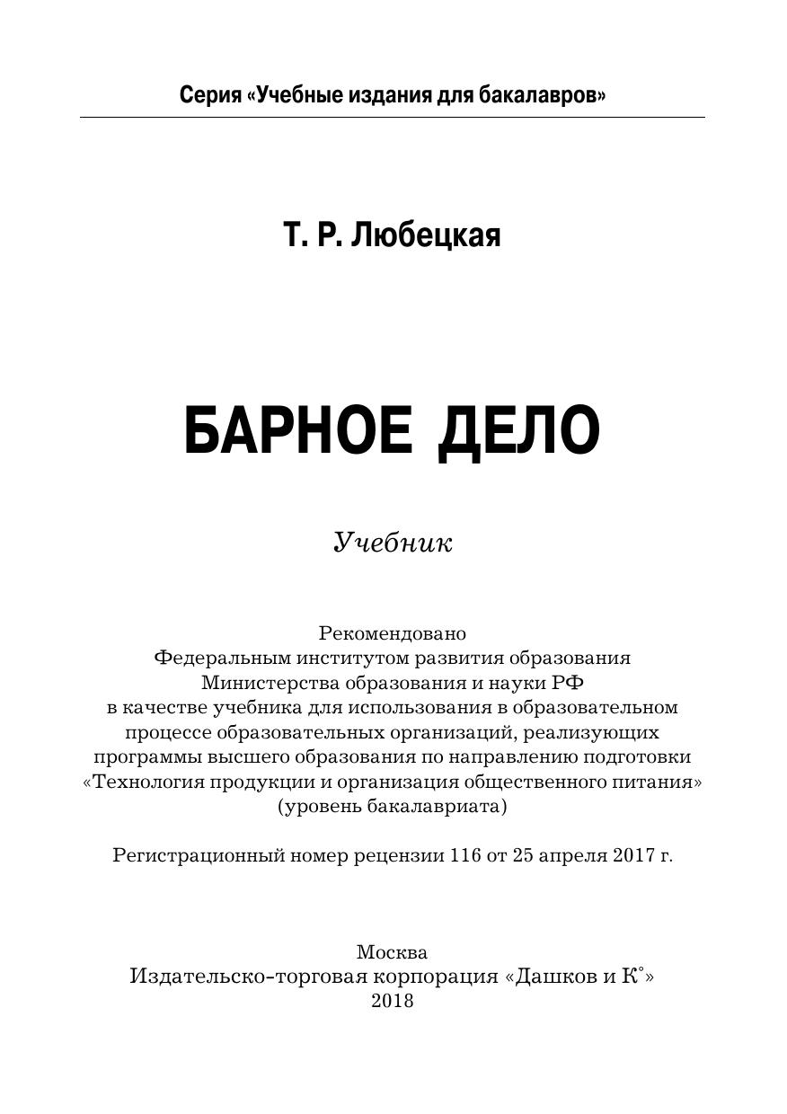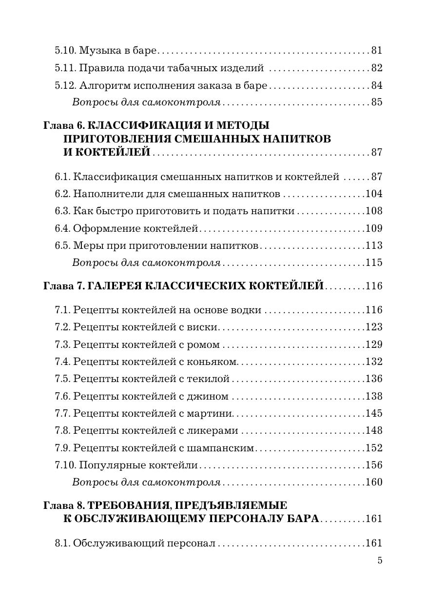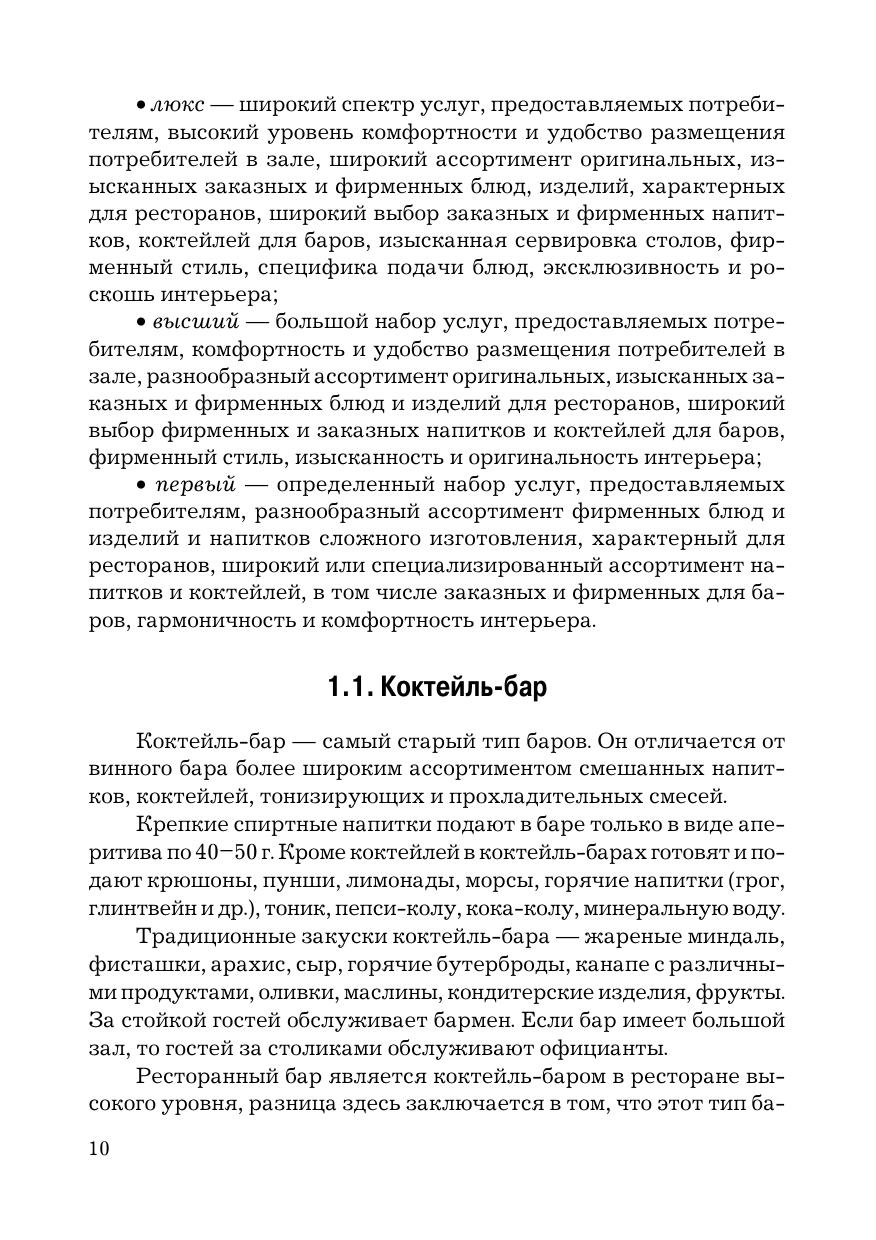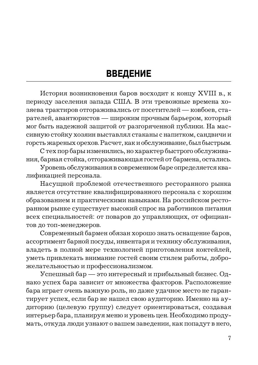 В учебнике раскрываются все аспекты барного дела: приведены классификация баров по ассортименту реализуемой продукции, стилю интерьера, характеристика компонентов для приготовления смешанных напитков; подробно рассмотрены барный инвентарь, посуда, мебель; изложены технология обслуживания в барах, требования к персоналу. Также представлен широкий перечень рецептов алкогольных и безалкогольных напитков, рассказаны истории их возникновения. Для студентов бакалавриата, обучающихся по направлению подготовки «Технология продукции и организация общественного питания», работников ресторанного дела.
