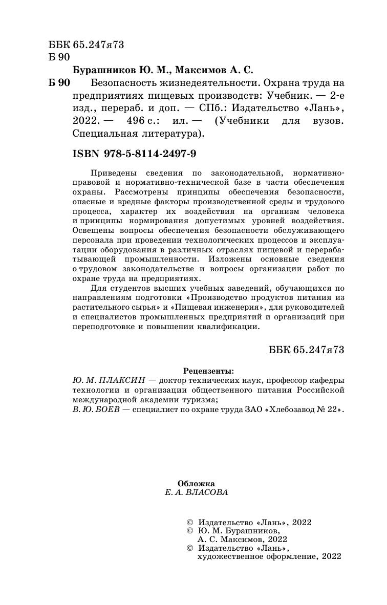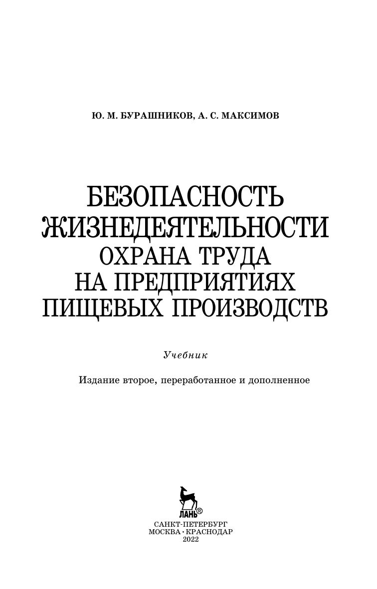 Приведены сведения по законодательной, нормативно-правовой и нормативно-технической базе в части обеспечения охраны. Рассмотрены принципы обеспечения безопасности, опасные и вредные факторы производственной среды и трудового процесса, характер их воздействия на организм человека и принципы нормирования допустимых уровней воздействия. Освещены вопросы обеспечения безопасности обслуживающего персонала при проведении технологических процессов и эксплуатации оборудования в различных отраслях пищевой и перерабатывающей промышленности. Изложены основные сведения о трудовом законодательстве и вопросы организации работ по охране труда на предприятиях. Для студентов высших учебных заведений, обучающихся по направлениям подготовки «Производство продуктов питания из растительного сырья» и «Пищевая инженерия», для руководителей и специалистов промышленных предприятий и организаций при переподготовке и повышении квалификации.