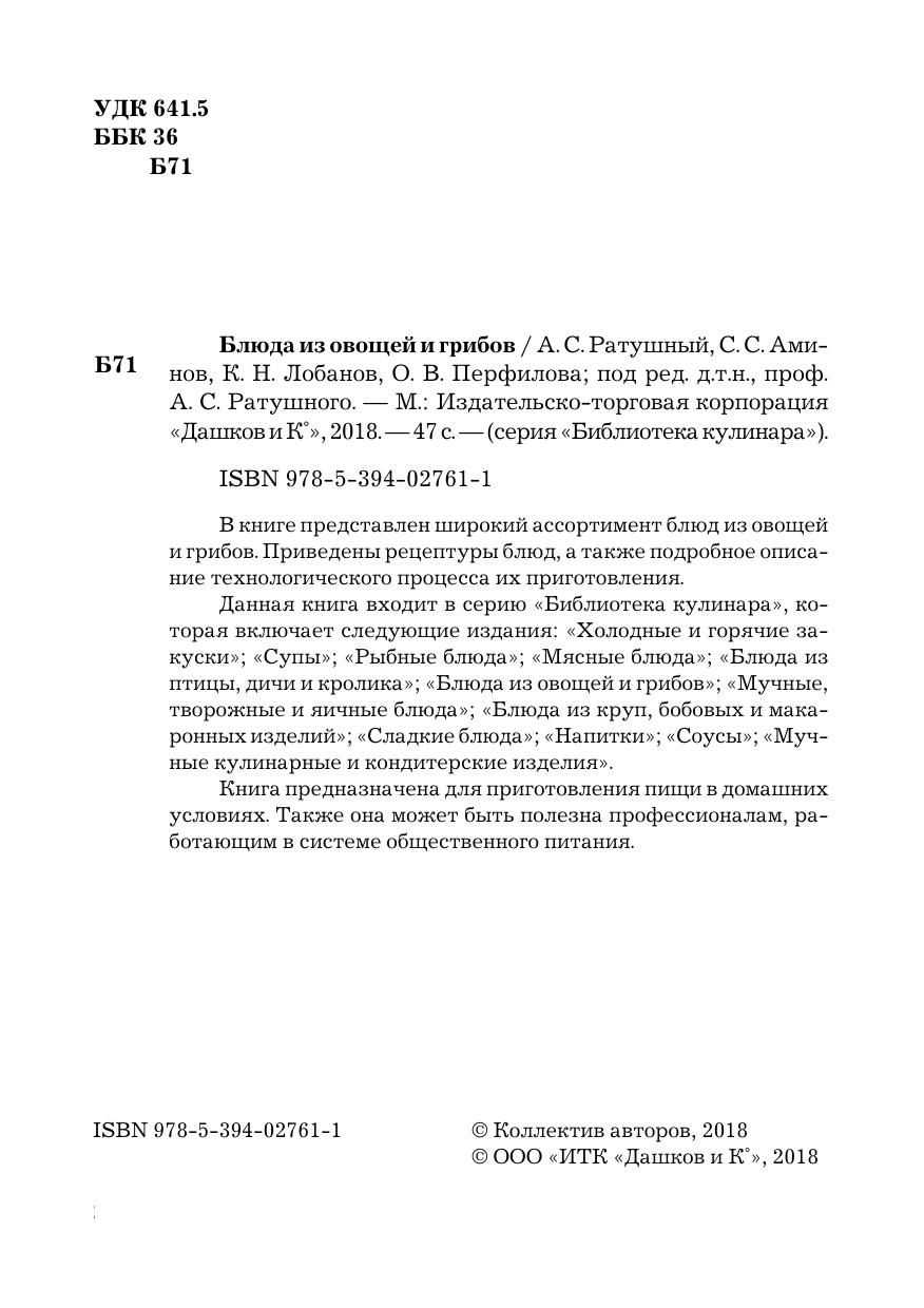 В книге представлен широкий ассортимент блюд из овощей и грибов. Приведены рецептуры блюд, а также подробное описание технологического процесса их приготовления. Данная книга входит в серию «Библиотека кулинара», которая включает следующие издания: «Холодные и горячие закуски»; «Супы»; «Рыбные блюда»; «Мясные блюда»; «Блюда из птицы, дичи и кролика»; «Блюда из овощей и грибов»; «Мучные, творожные и яичные блюда»; «Блюда из круп, бобовых и макаронных изделий»; «Сладкие блюда»; «Напитки»; «Соусы»; «Мучные кулинарные и кондитерские изделия». Книга предназначена для приготовления пищи в домашних условиях. Также она может быть полезна профессионалам, работающим в системе общественного питания.