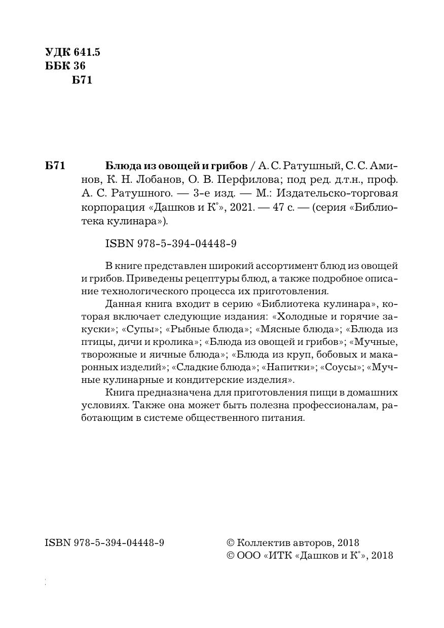 В книге представлен широкий ассортимент блюд из овощей и грибов. Приведены рецептуры блюд, а также подробное описание технологического процесса их приготовления. Данная книга входит в серию «Библиотека кулинара», которая включает следующие издания: «Холодные и горячие закуски», «Супы», «Рыбные блюда», «Мясные блюда», «Блюда из птицы, дичи и кролика», «Блюда из овощей и грибов», «Мучные, творожные и яичные блюда», «Блюда из круп, бобовых и макаронных изделий», «Сладкие блюда», «Напитки», «Соусы», «Мучные кулинарные и кондитерские изделия». Книга предназначена для приготовления пищи в домашних условиях. Также она может быть полезна профессионалам, работающим в системе общественного питания.
