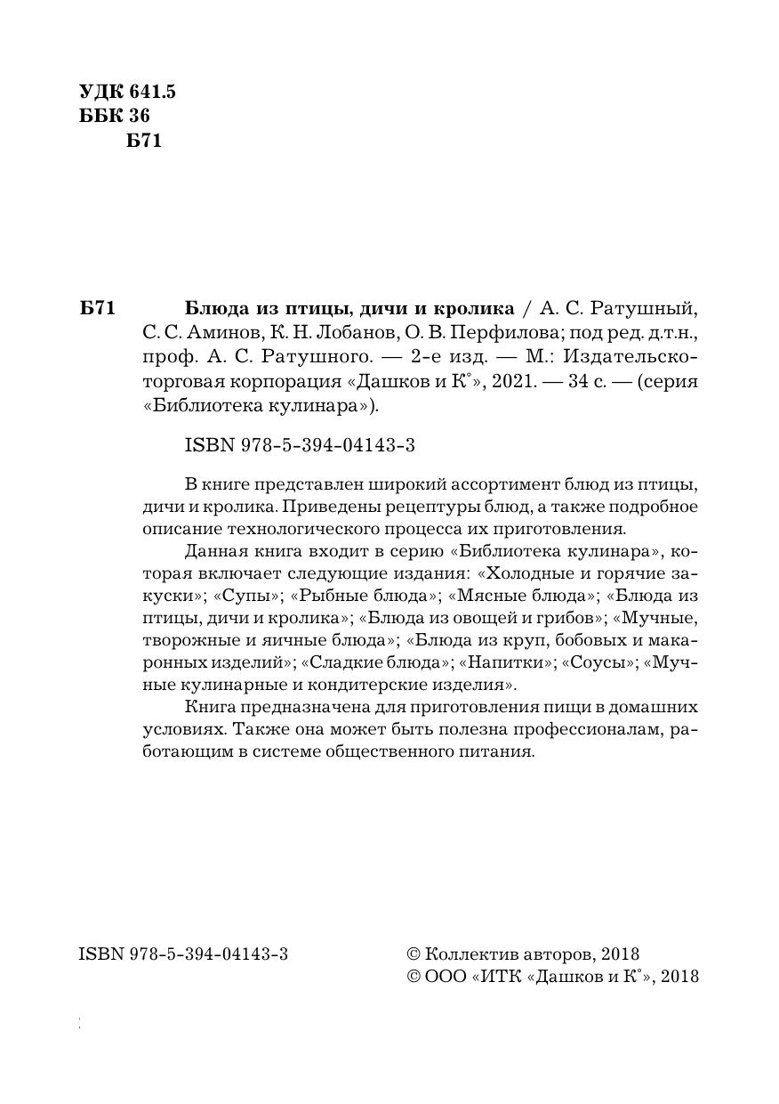 В книге представлен широкий ассортимент блюд из птицы, дичи и кролика. Приведены рецептуры блюд, а также подробное описание технологического процесса их приготовления. Данная книга входит в серию «Библиотека кулинара», которая включает следующие издания: «Холодные и горячие закуски», «Супы», «Рыбные блюда», «Мясные блюда», «Блюда из птицы, дичи и кролика», «Блюда из овощей и грибов», «Мучные, творожные и яичные блюда», «Блюда из круп, бобовых и макаронных изделий», «Сладкие блюда», «Напитки», «Соусы», «Мучные кулинарные и кондитерские изделия». Книга предназначена для приготовления пищи в домашних условиях. Также она может быть полезна профессионалам, работающим в системе общественного питания.