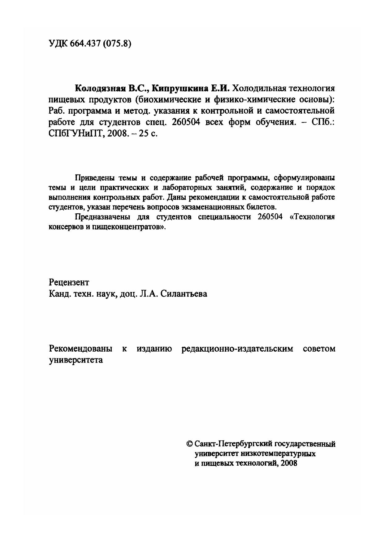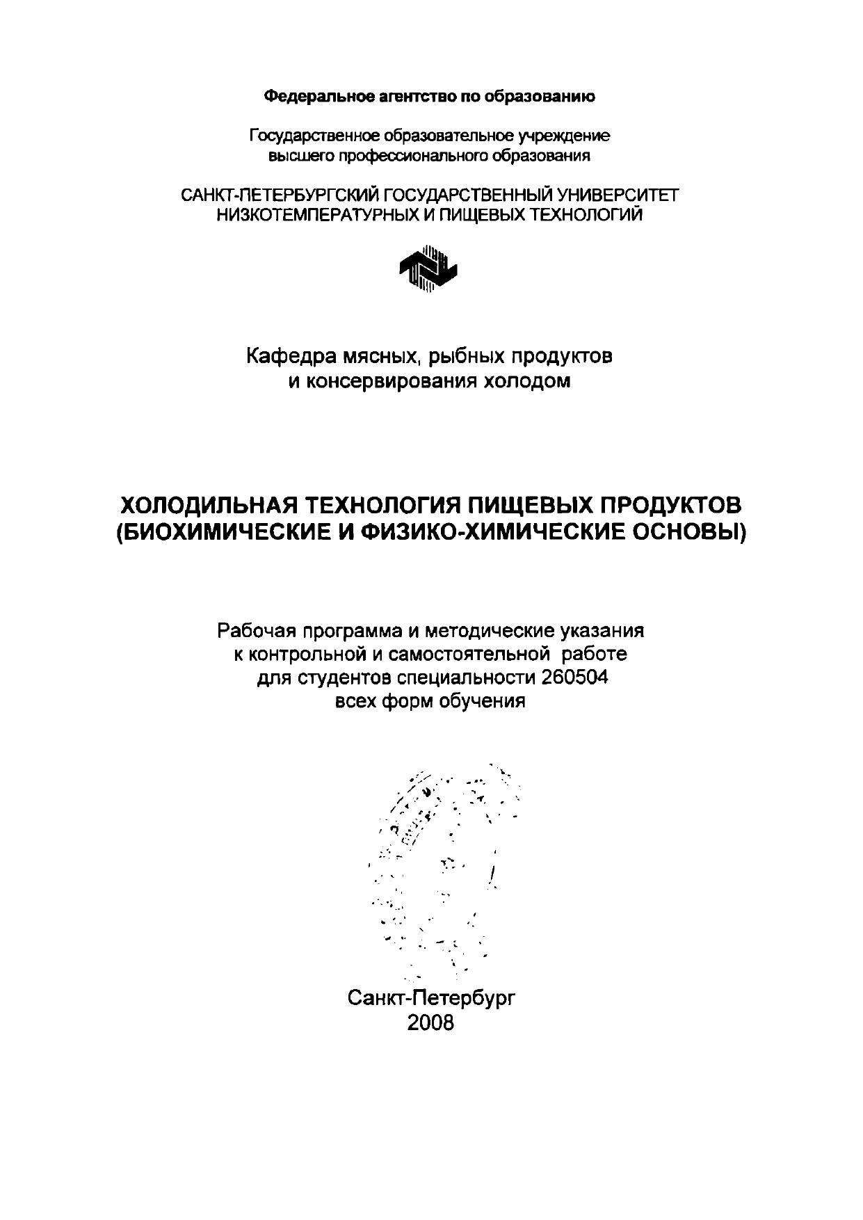 Холодильная технология пищевых продуктов (биохимические и физико-химические основы): Рабочая программа и метод, указания к контрольной и самостоятельной работе для студентов спец. 260504 всех форм обучения