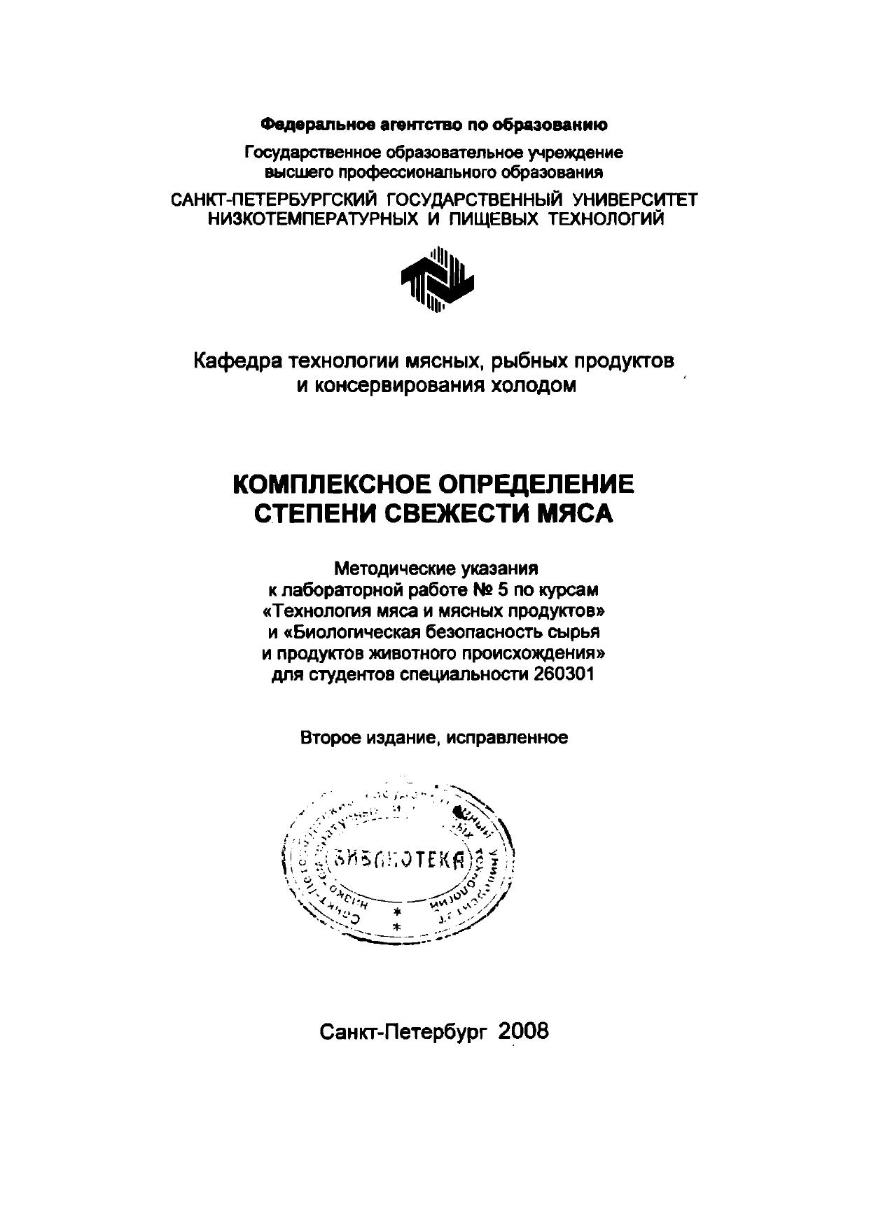 Комплексное определение степени свежести мяса: Методические указания к лабораторной работе № 5 по курсам «Технология мяса и мясных продуктов» и «Биологическая безопасность сырья и продуктов животного происхождения» для студентов спец. 260301