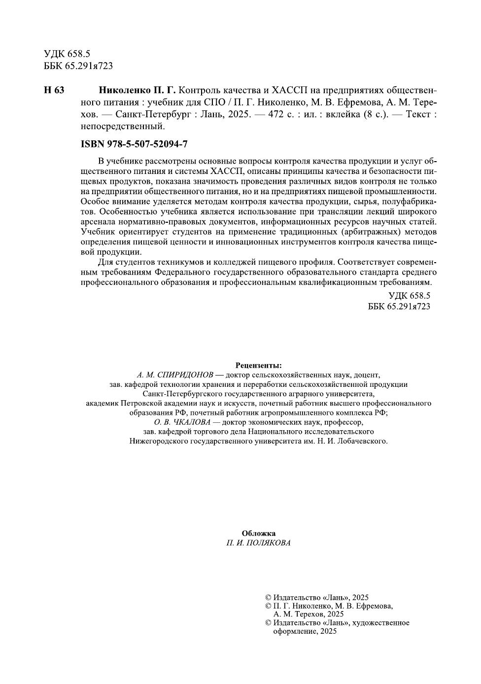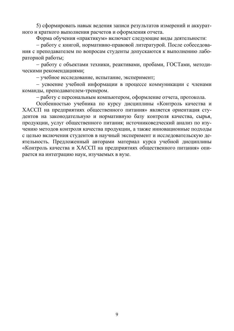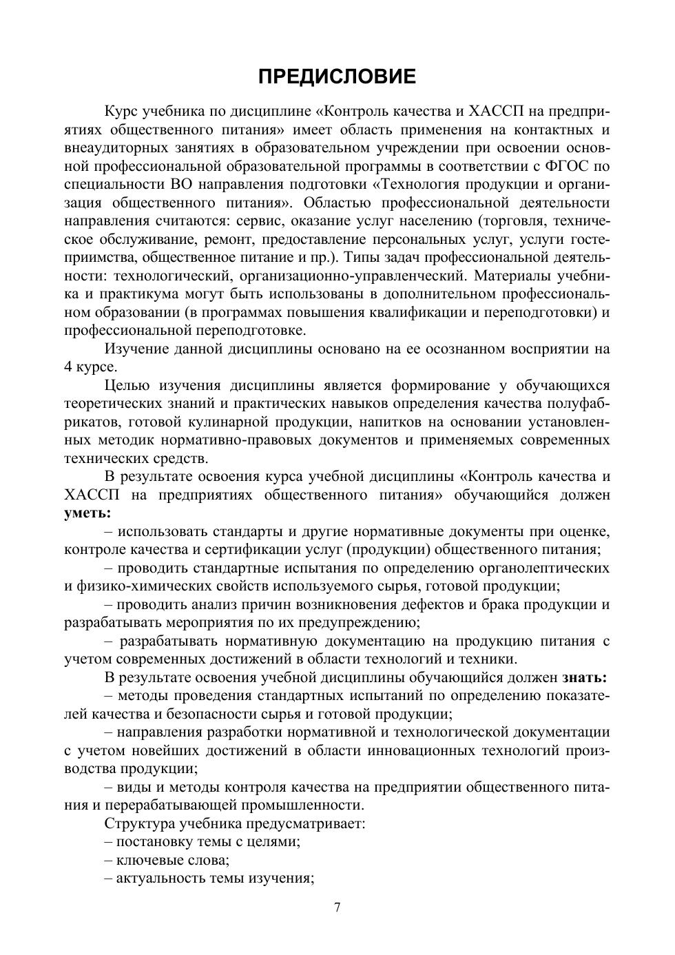 В учебнике рассмотрены основные вопросы контроля качества продукции и услуг общественного питания и системы ХАССП, описаны принципы качества и безопасности пищевых продуктов, показана значимость проведения различных видов контроля не только на предприятии общественного питания, но и на предприятиях пищевой промышленности. Особое внимание уделяется методам контроля качества продукции, сырья, полуфабрикатов. Особенностью учебника является использование при трансляции лекций широкого арсенала нормативно-правовых документов, информационных ресурсов научных статей. Учебник ориентирует студентов на применение традиционных (арбитражных) методов определения пищевой ценности и инновационных инструментов контроля качества пищевой продукции. Для студентов техникумов и колледжей пищевого профиля. Соответствует современным требованиям Федерального государственного образовательного стандарта среднего профессионального образования и профессиональным квалификационным требованиям.