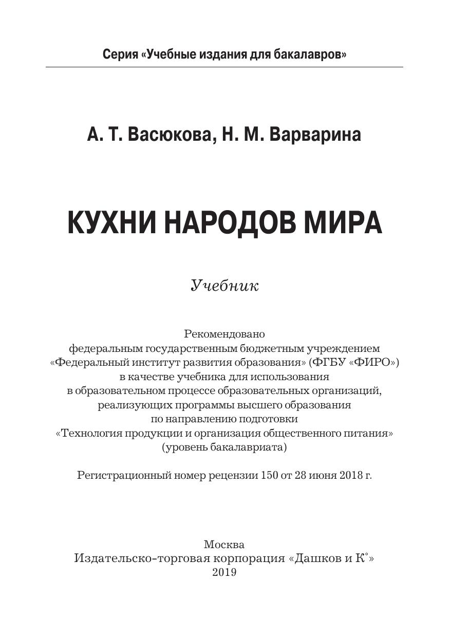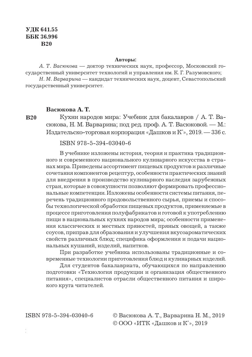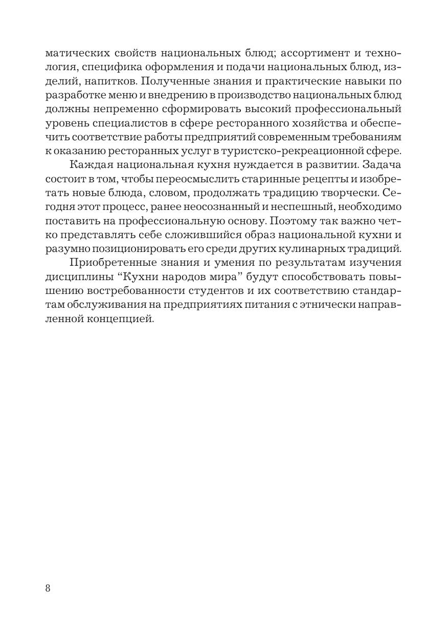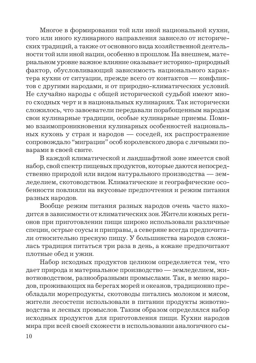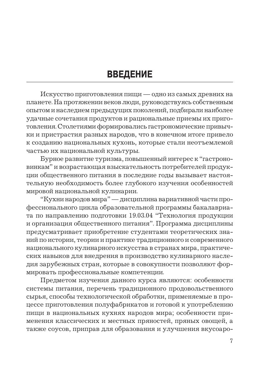 В учебнике изложены история, теория и практика традиционного и современного национального кулинарного искусства в странах мира. Приведены ассортимент пищевых продуктов и различные сочетания компонентов рецептур, особенности практических знаний для внедрения в производство кулинарного наследия зарубежных стран, которые в совокупности позволяют формировать профессиональные компетенции. Изложены особенности системы питания, перечень традиционного продовольственного сырья, приемы и способы технологической обработки пищевых продуктов, применяемые в процессе приготовления полуфабрикатов и готовой к употреблению пищи в национальных кухнях народов мира; особенности применения классических и местных пряностей, пряных овощей, а также соусов, приправ для образования и улучшения вкусоароматических свойств различных блюд; специфика оформления и подачи национальных кушаний, изделий, напитков. При разработке учебника использованы традиционные и современные технологии приготовления блюд и кулинарных изделий. Для студентов бакалавриата, обучающихся по направлению подготовки «Технология продукции и организация общественного питания», специалистов отрасли общественного питания и широкого круга читателей.