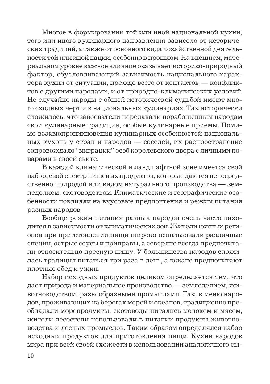 В учебнике изложены история, теория и практика традиционного и современного национального кулинарного искусства в странах мира. Приведены ассортимент пищевых продуктов и различные сочетания компонентов рецептур, особенности практических знаний для внедрения в производство кулинарного наследия зарубежных стран, которые в совокупности позволяют формировать профессиональные компетенции. Изложены особенности системы питания, перечень традиционного продовольственного сырья, приемы и способы технологической обработки пищевых продуктов, применяемые в процессе приготовления полуфабрикатов и готовой к употреблению пищи в национальных кухнях народов мира, особенности применения классических и местных пряностей, пряных овощей, а также соусов, приправ для образования и улучшения вкусоароматических свойств различных блюд, специфика оформления и подачи национальных кушаний, изделий, напитков. При разработке учебника использованы традиционные и современные технологии приготовления блюд и кулинарных изделий. Для студентов бакалавриата, обучающихся по направлению подготовки «Технология продукции и организация общественного питания», специалистов отрасли общественного питания и широкого круга читателей.