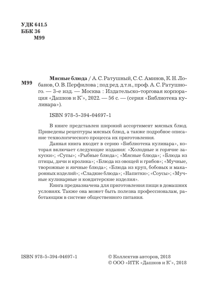 В книге представлен широкий ассортимент мясных блюд. Приведены рецептуры мясных блюд, а также подробное описание технологического процесса их приготовления. Данная книга входит в серию «Библиотека кулинара», которая включает следующие издания: «Холодные и горячие закуски», «Супы», «Рыбные блюда», «Мясные блюда», «Блюда из птицы, дичи и кролика», «Блюда из овощей и грибов», «Мучные, творожные и яичные блюда», «Блюда из круп, бобовых и макаронных изделий», «Сладкие блюда», «Напитки», «Соусы», «Мучные кулинарные и кондитерские изделия». Книга предназначена для приготовления пищи в домашних условиях. Также она может быть полезна профессионалам, работающим в системе общественного питания.