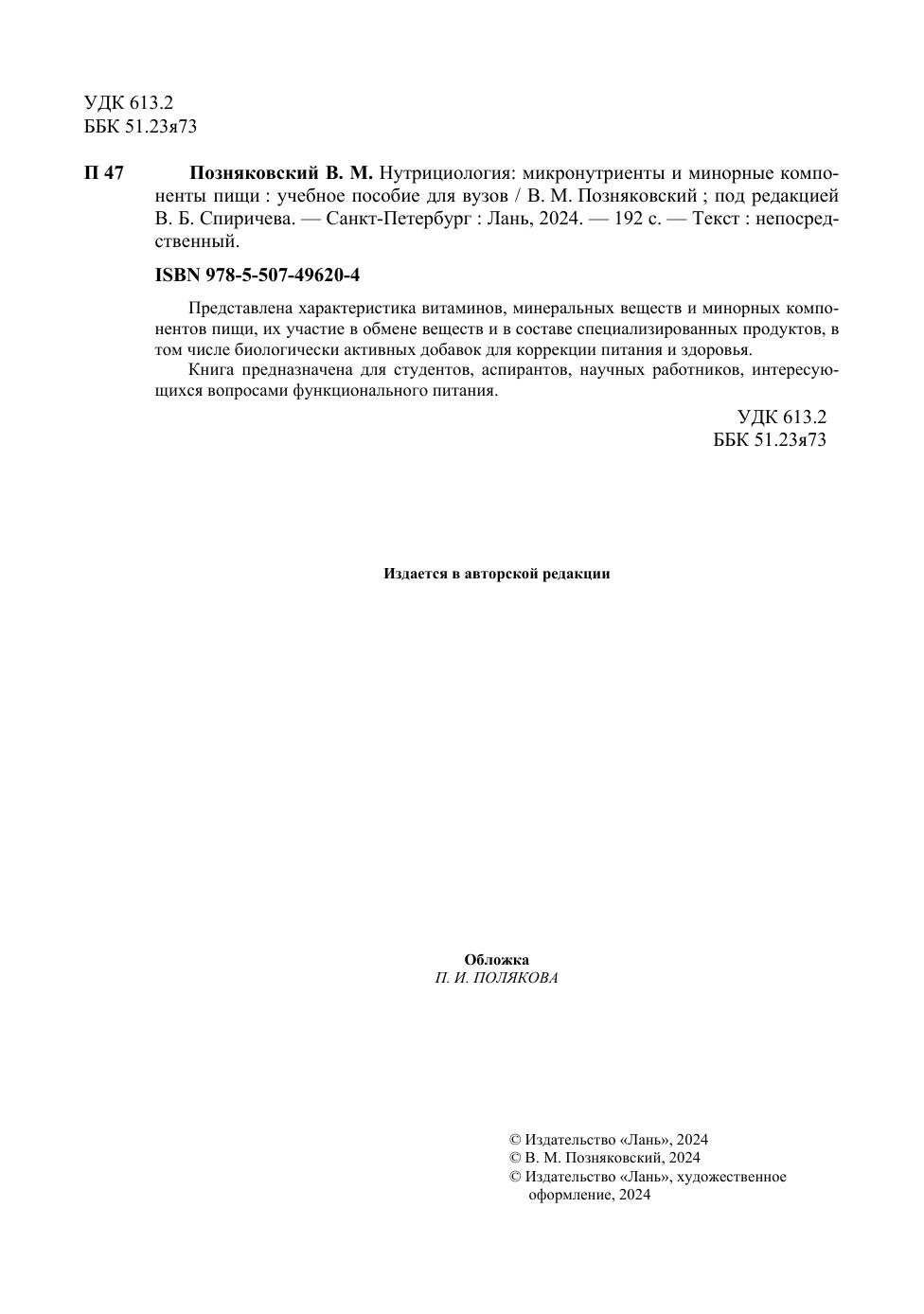 Представлена характеристика витаминов, минеральных веществ и минорных компонентов пищи, их участие в обмене веществ и в составе специализированных продуктов, в том числе биологически активных добавок для коррекции питания и здоровья. Книга предназначена для студентов, аспирантов, научных работников, интересующихся вопросами функционального питания.