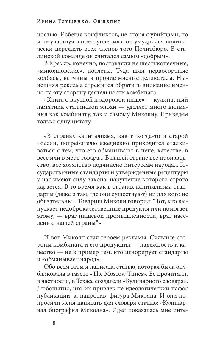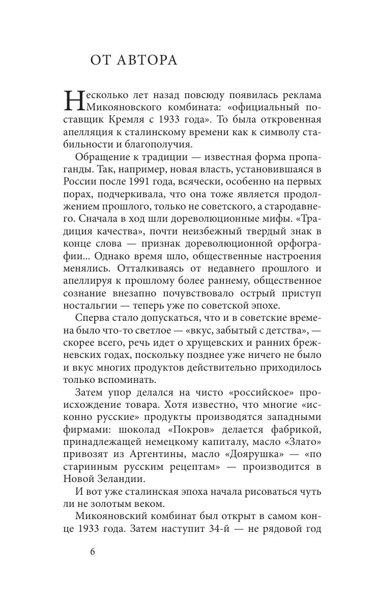 Книга Ирины Глущенко, переводчика, журналиста и исследователя советского быта, посвящена возникновению советской кухни, роли, которую играл в этом процессе Анастас Микоян, связи между общей логикой развития советской системы и ее конкретными бытовыми проявлениями. Отдельное место занимает глава о «Книге о вкусной и здоровой пище», где данный памятник советской эпохи рассматривается с эстетической, идеологической и историко-культурной точек зрения. В книге использованы уникальные архивные материалы, ранее не публиковавшиеся и не цитировавшиеся, а также фотографии из архива семьи А.И. Микояна. Книга адресована широкому кругу читателей.