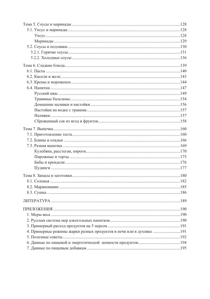 Приведены проверенные многолетней практикой рекомендации и советы для приготовления первых и вторых блюд, холодных и горячих закусок, соусов, маринадов, напитков, мучной выпечки, сладких блюд, пасхи и мороженого, приготовляемых в домашних условиях. Многие приведенные в издании блюда русской кухни хорошо известны и пользуются неизменным успехом. Для всех из них характерно исключительное использование самого свежего натурального и высококачественного растительного и животного пищевого сырья.