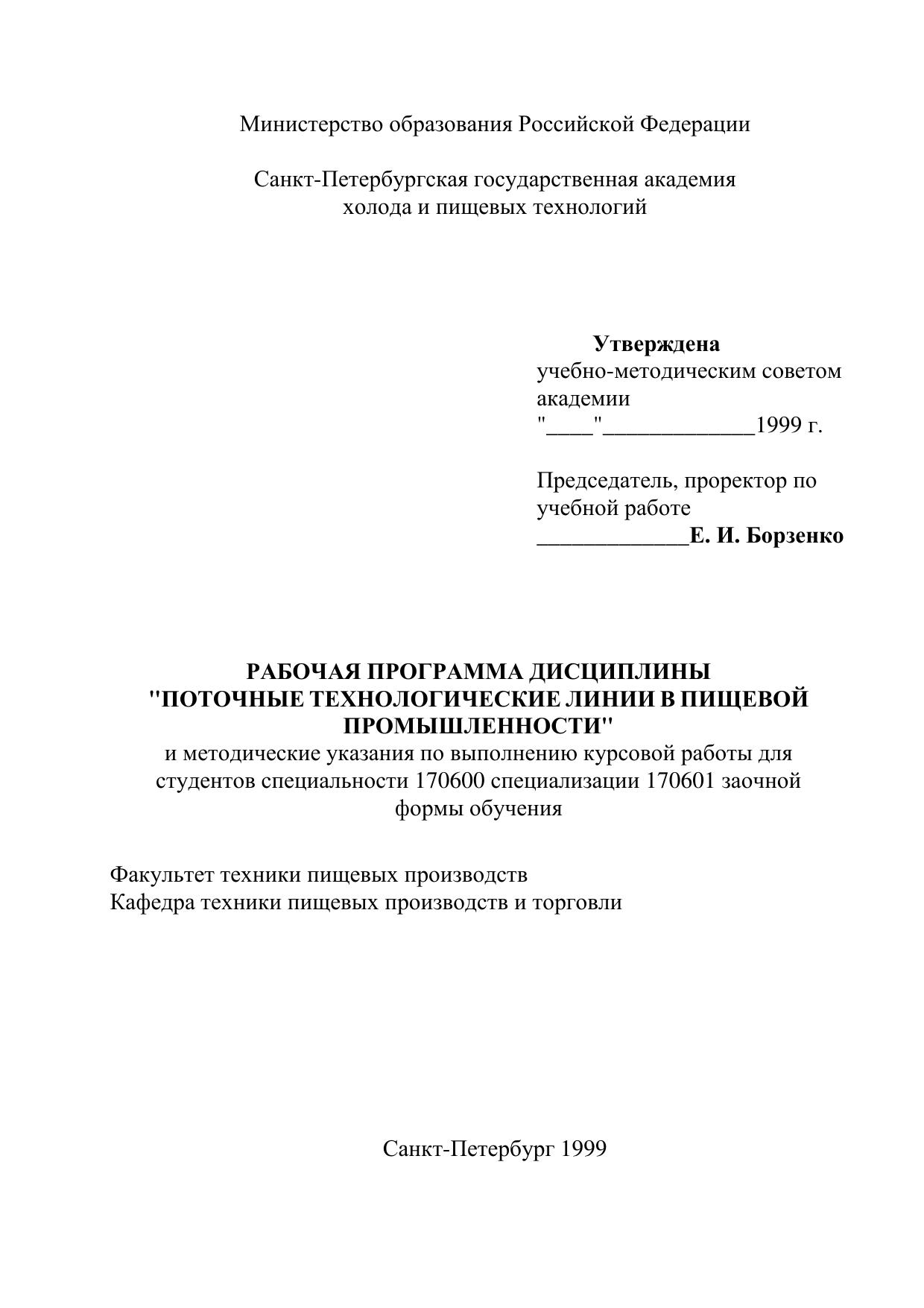 Поточные технологические линии в пищевой промышленности. Рабочая программа и методические указания для студентов спец. 170600 спец. 170601 заочной формы обучения