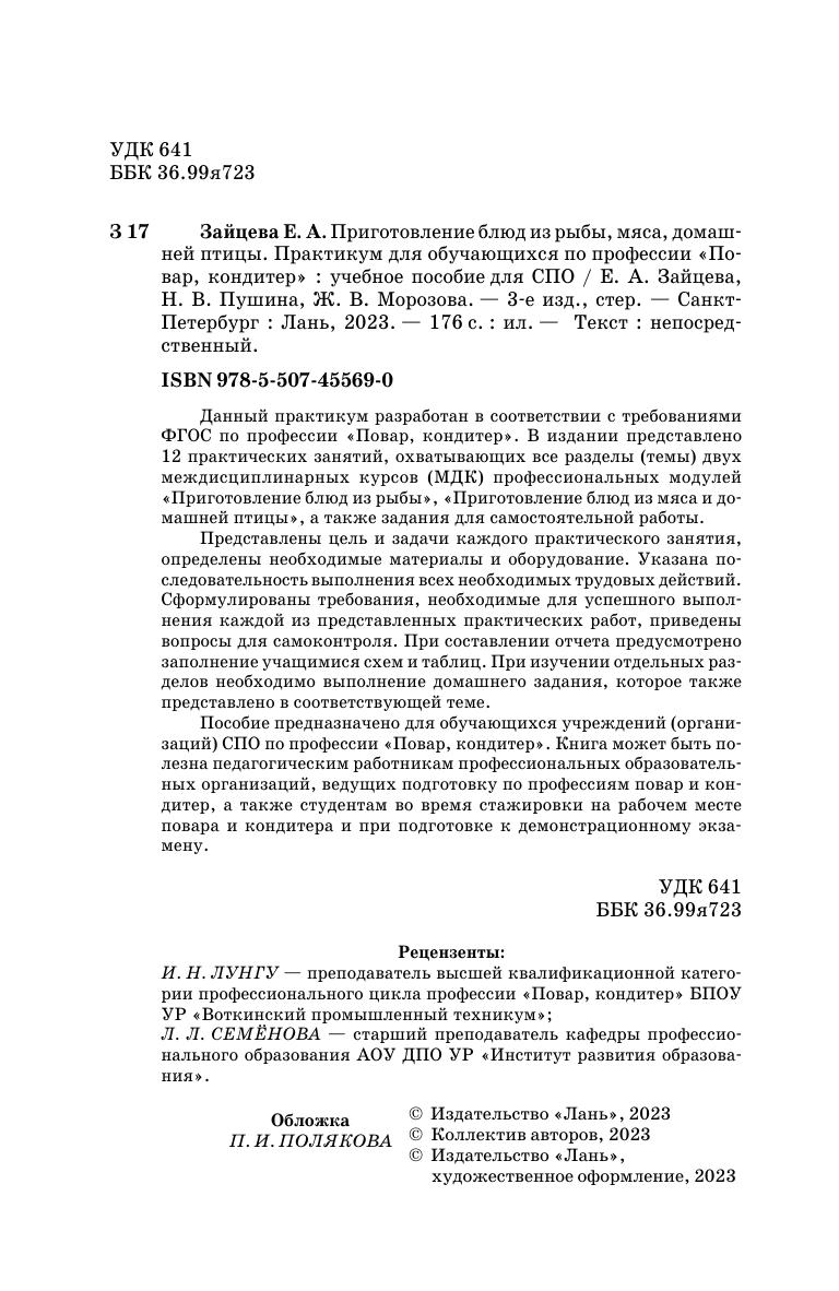 Данный практикум разработан в соответствии с требованиями ФГОС по профессии Повар, кондитер. В издании представлено 12 практических занятий, охватывающих все разделы, темы двух междисциплинарных курсов, МДК, профессиональных модулей: Приготовление блюд из рыбы, Приготовление блюд из мяса и домашней птицы, а также задания для самостоятельной работы.Представлены цель и задачи каждого практического занятия, определены необходимые материалы и оборудование. Указана последовательность выполнения всех необходимых трудовых действий. Сформулированы требования, необходимые для успешного выполнения каждой из представленных практических работ, приведены вопросы для самоконтроля. При составлении отчета предусмотрено заполнение учащимися схем и таблиц. При изучении отдельных разделов необходимо выполнение домашнего задания, которое также представлено в соответствующей теме.Пособие предназначено для обучающихся ссузов по профессии - Повар, кондитер. Книга может быть полезна педагогическим работникам профессиональных образовательных организаций, ведущих подготовку по профессиям повар и кондитер, а также студентам во время стажировки на рабочем месте повара и кондитера и при подготовке к демонстрационному экзамену.