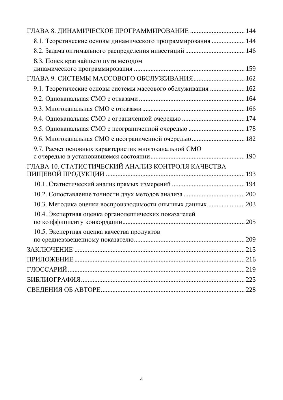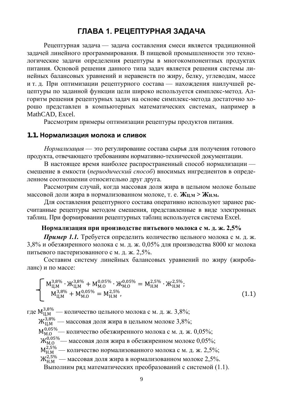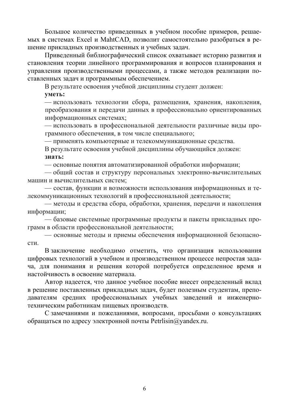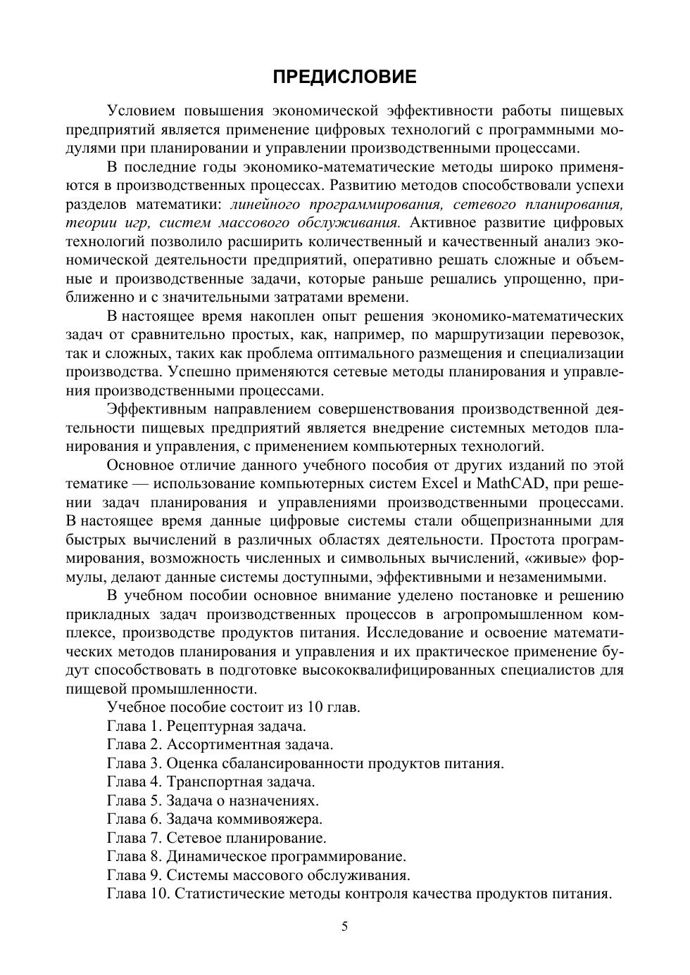 В учебном пособии рассмотрены классические задачи линейного программирования, системы массового обслуживания, статистического анализа качества продуктов питания и методологии оценки сбалансированности продуктов питания. Теоретическая часть пособия дополняется детально разобранными практическими примерами. Приводятся примеры решения прикладных задач с использованием цифровых систем — Excel, MathCAD. Соответствует современным требованиям Федерального государственного образовательного стандарта среднего профессионального образования и профессиональным квалификационным требованиям. Учебное пособие будет полезным при обучении студентов колледжей и техникумов по специальностям «Технология продуктов питания животного происхождения», «Технология продуктов питания из растительного сырья», «Технология продуктов питания массового изготовления», «Биотехнология пищевой промышленности». Будет полезным для научных работников и широкого круга специалистов, занимающихся вопросами разработки рецептур и оценкой сбалансированности продуктов питания. Использование пособия позволит повысить уровень компьютерной грамотности студентов и специалистов, оперативно решать учебные и производственные задачи.