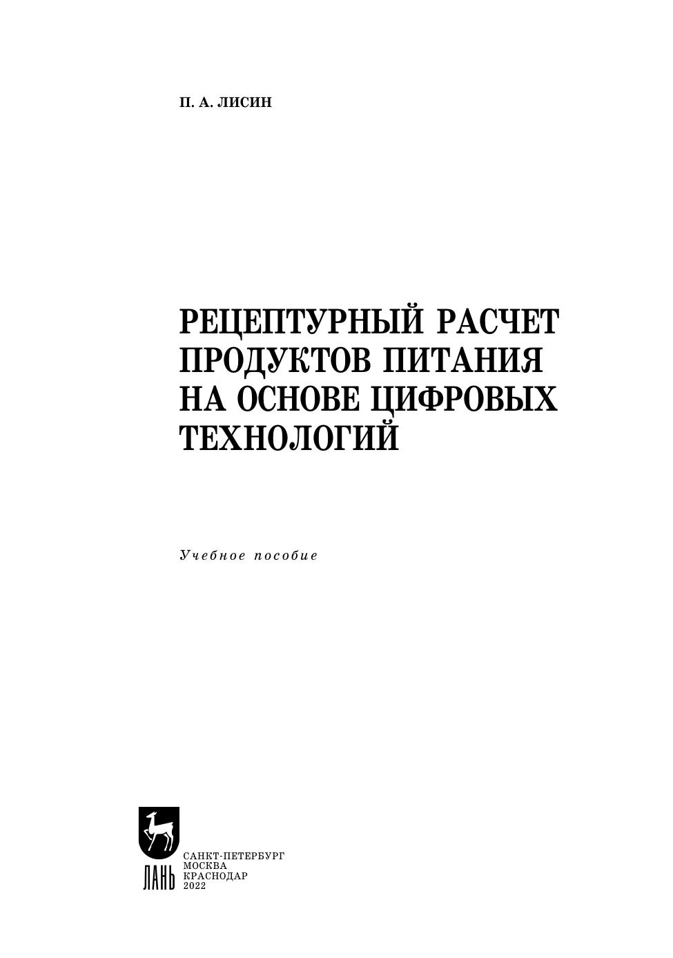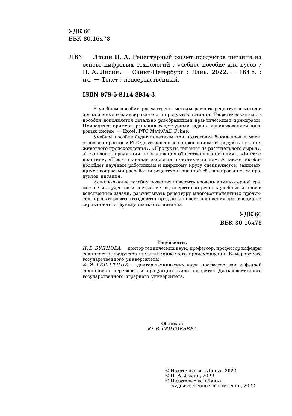 В учебном пособии рассмотрены методы расчета рецептур и методо-логия оценки сбалансированности продуктов питания. Теоретическая часть пособия дополняется детально разобранными практическими примерами. Приводятся примеры решения рецептурных задач с использованием циф-ровых систем — Excel, РТС MathCAD Prime.