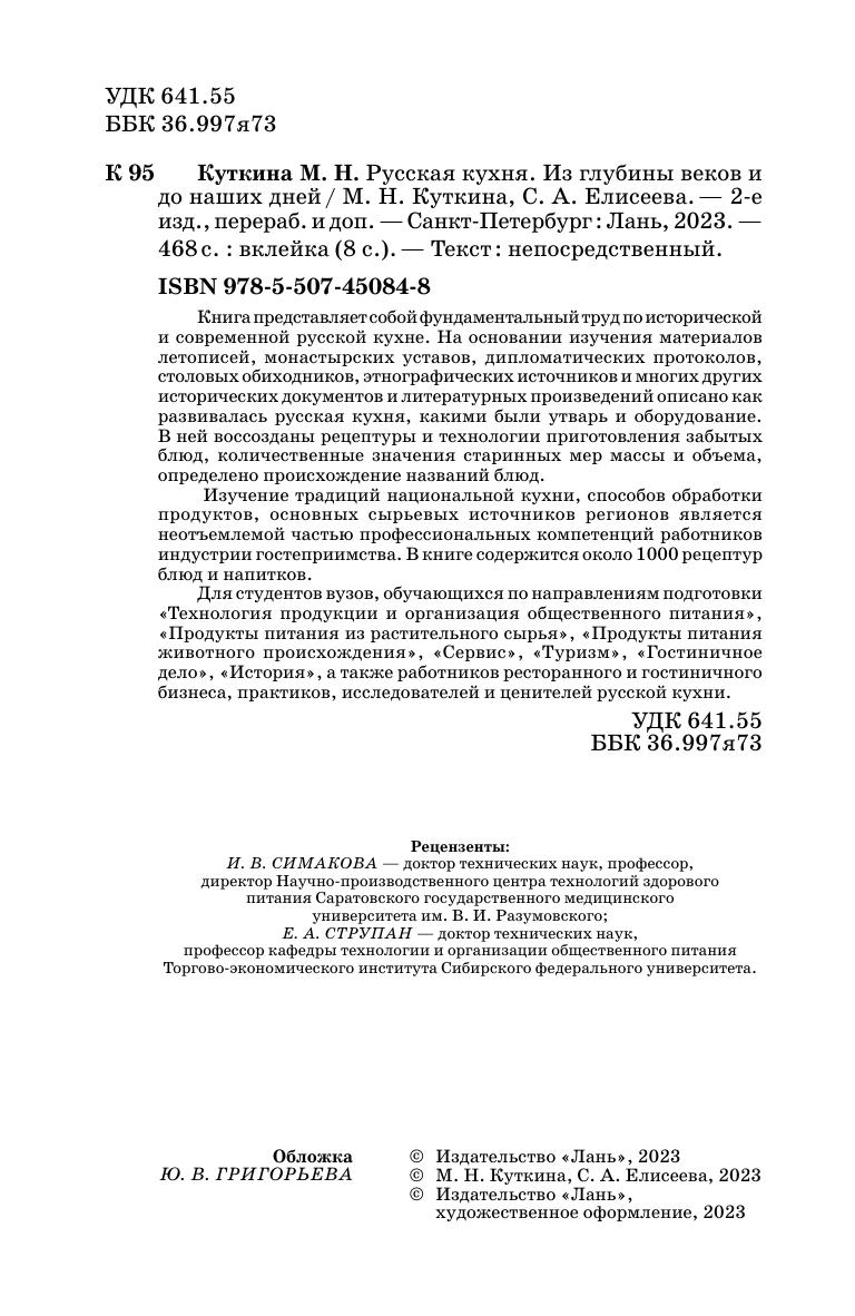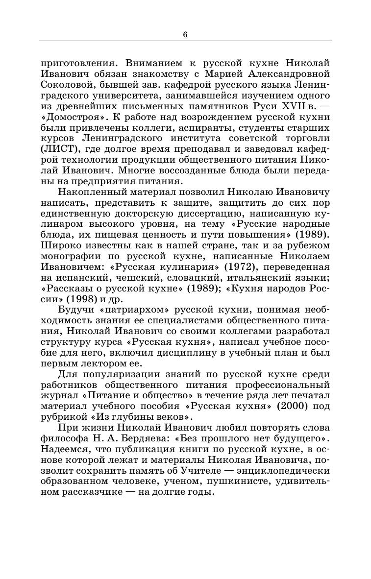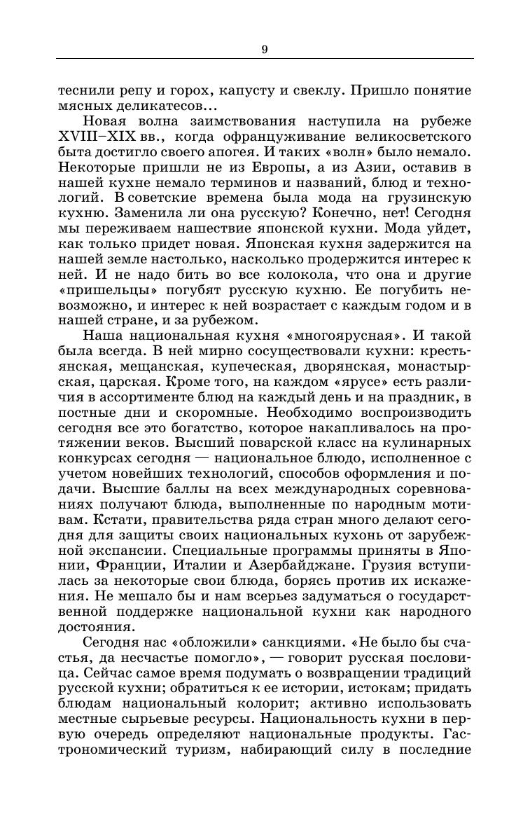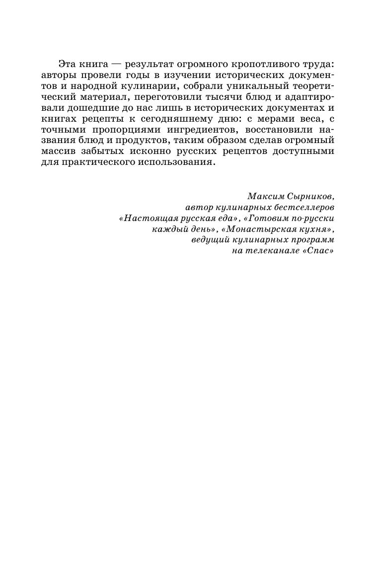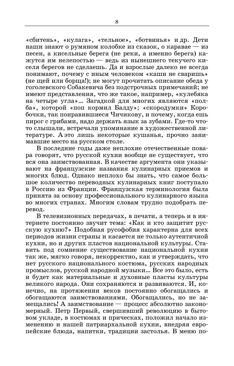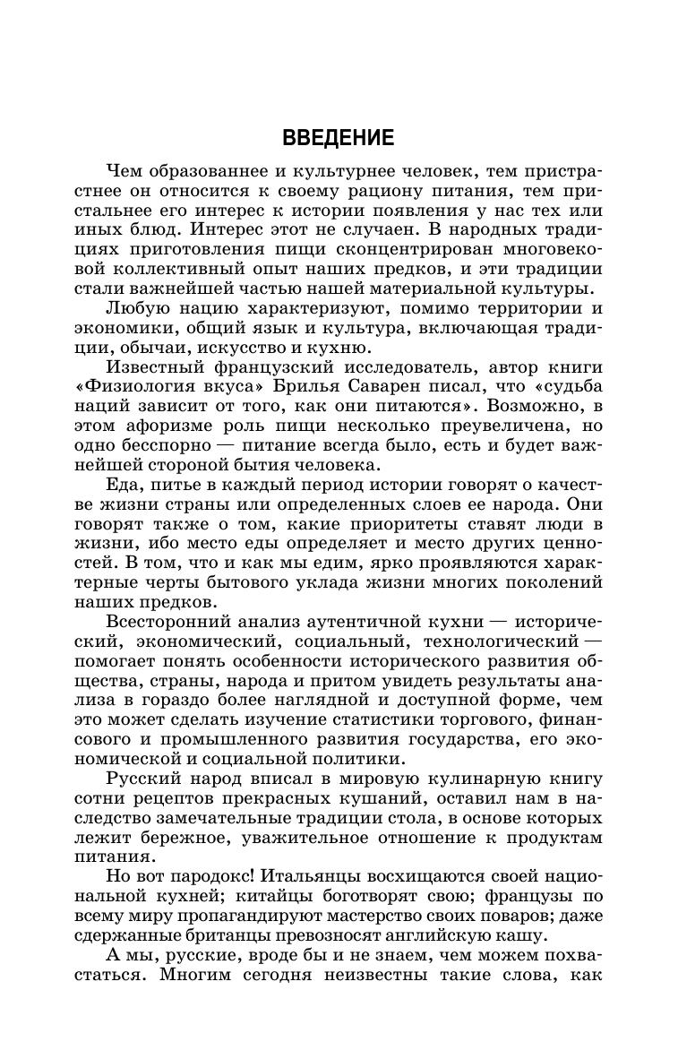 Книга представляет собой фундаментальный труд по исторической и современной русской кухне. На основании изучения материалов летописей, монастырских уставов, дипломатических протоколов, столовых обиходников, этнографических источников и многих других исторических документов и литературных произведений описано как развивалась русская кухня, какими были утварь и оборудование. В ней воссозданы рецептуры и технологии приготовления забытых блюд, количественные значения старинных мер массы и объема, определено происхождение названий блюд. Изучение традиций национальной кухни, способов обработки продуктов, основных сырьевых источников регионов является неотъемлемой частью профессиональных компетенций работников индустрии гостеприимства. В книге содержится около 1000 рецептур блюд и напитков. Для студентов вузов, обучающихся по направлениям подготовки «Технология продукции и организация общественного питания», «Продукты питания из растительного сырья», «Продукты питания животного происхождения», «Сервис», «Туризм», «Гостиничное дело», «История», а также работников ресторанного и гостиничного бизнеса, практиков, исследователей и ценителей русской кухни.