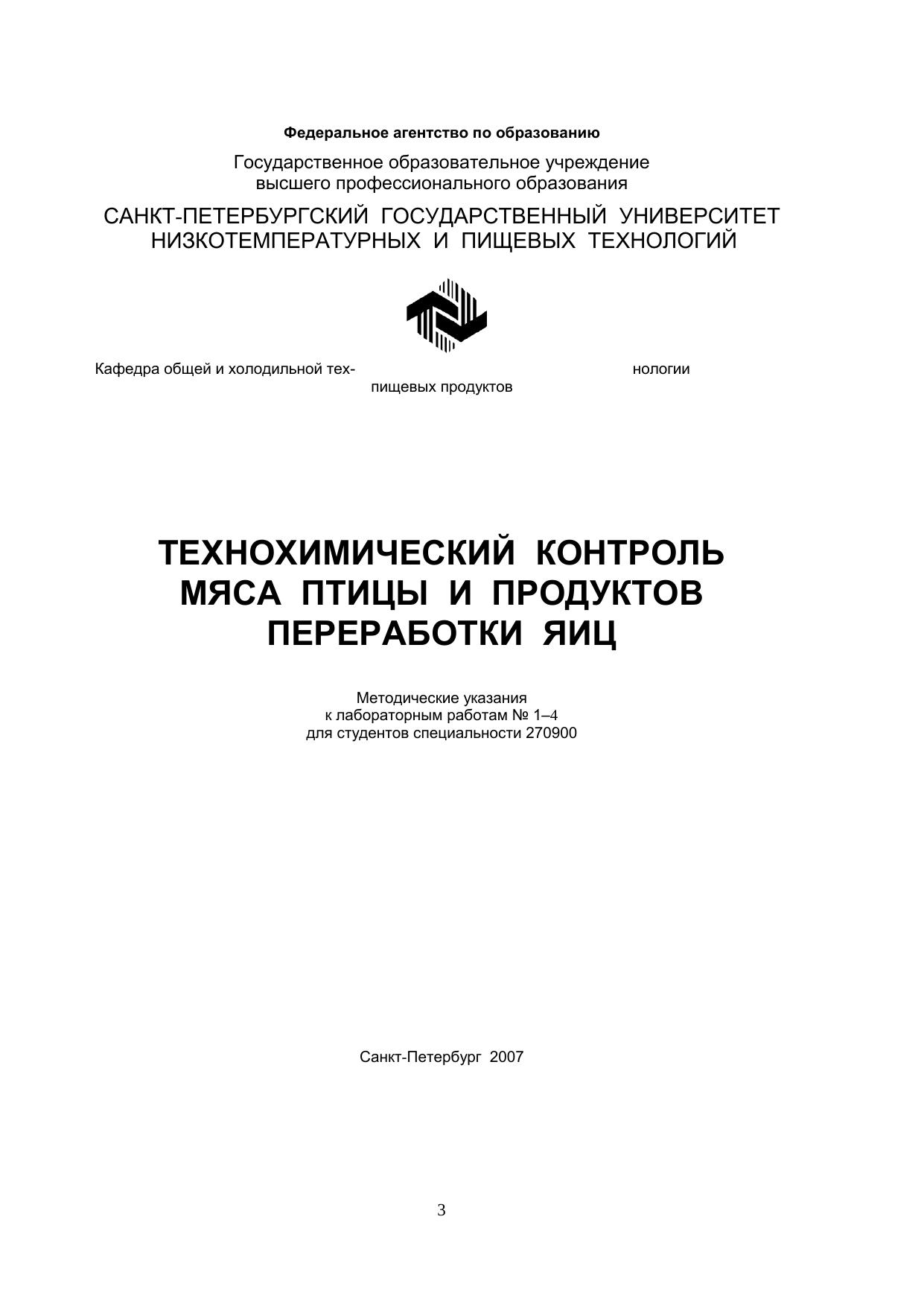 Технохимический контроль мяса птицы и продуктов переработки яиц: Методические указания к лабораторным работам 1–4 для студентов специальности 270900