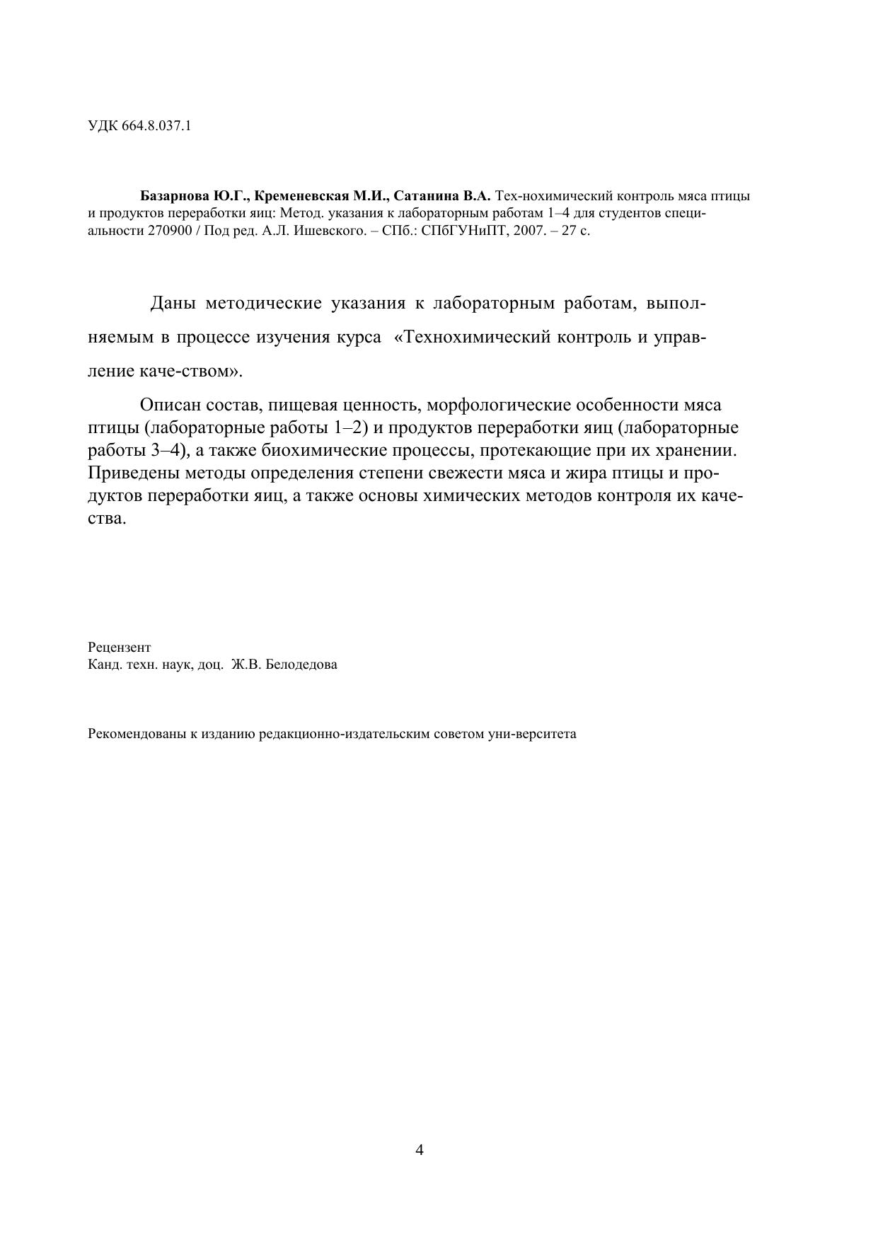 Даны методические указания к лабораторным работам, выполняемым в процессе изучения курса «Технохимический контроль и управление качеством». Описан состав, пищевая ценность, морфологические особенности мяса птицы (лабораторные работы 1–2) и продуктов переработки яиц (лабораторные работы 3–4), а также биохимические процессы, протекающие при их хранении. Приведены методы определения степени свежести мяса и жира птицы и продуктов переработки яиц, а также основы химических методов контроля их качества.