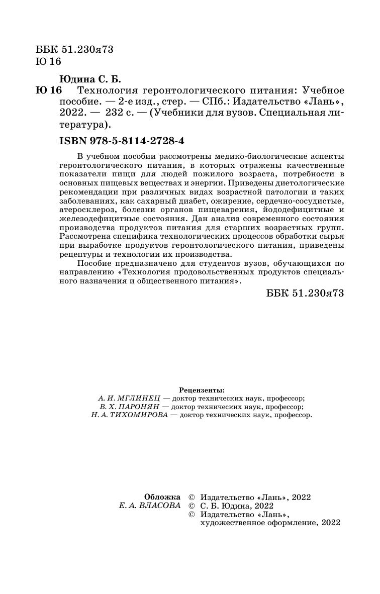 В учебном пособии рассмотрены медико-биологические аспекты геронтологического питания, в которых отражены качественные показатели пищи для людей пожилого возраста, потребности в основных пищевых веществах и энергии. Приведены диетологические рекомендации при различных видах возрастной патологии и таких заболеваниях, как сахарный диабет, ожирение, сердечно-сосудистые, атеросклероз, болезни органов пищеварения, йододефицитные и железодефицитные состояния. Дан анализ современного состояния производства продуктов питания для старших возрастных групп. Рассмотрена специфика технологических процессов обработки сырья при выработке продуктов геронтологического питания, приведены рецептуры и технологии их производства. Пособие предназначено для студентов вузов, обучающихся по направлению «Технология продовольственных продуктов специального назначения и общественного питания».