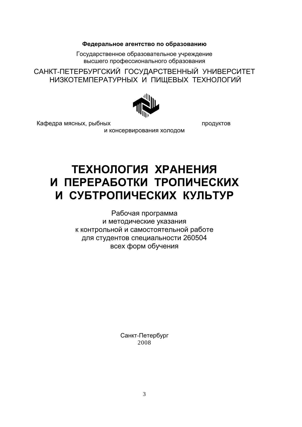 Технология хранения и переработки тропических и субтропических культур: Рабочая программа и метод. указания к контрольной и самостоятельной работе для студентов спец. 260504 всех форм обучения