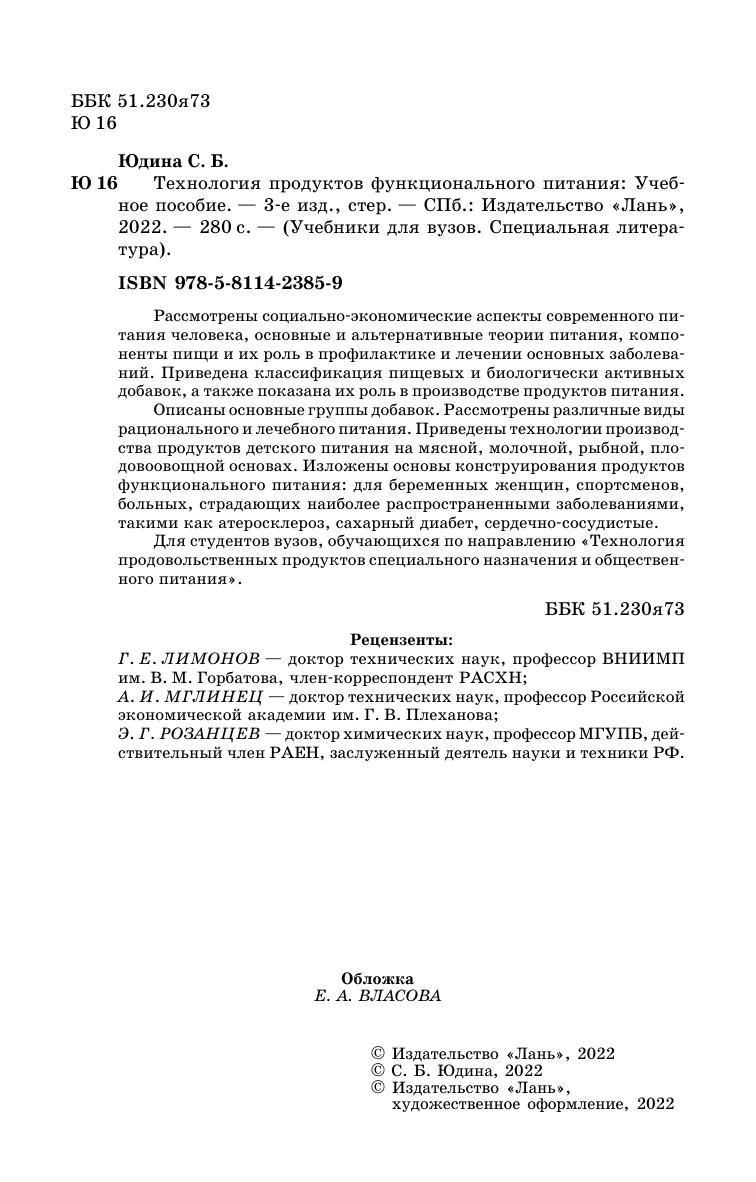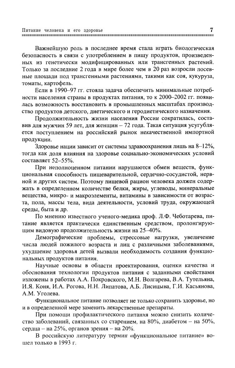 Рассмотрены социально-экономические аспекты современного питания человека, основные и альтернативные теории питания, компоненты пищи и их роль в профилактике и лечении основных заболеваний. Приведена классификация пищевых и биологически активных добавок, а также показана их роль в производстве продуктов питания. Описаны основные группы добавок. Рассмотрены различные виды рационального и лечебного питания. Приведены технологии производства продуктов детского питания на мясной, молочной, рыбной, плодовоовощной основах. Изложены основы конструирования продуктов функционального питания: для беременных женщин, спортсменов, больных, страдающих наиболее распространенными заболеваниями, такими как атеросклероз, сахарный диабет, сердечнососудистые. Для студентов вузов, обучающихся по направлению «Технология продовольственных продуктов специального назначения и общественного питания».