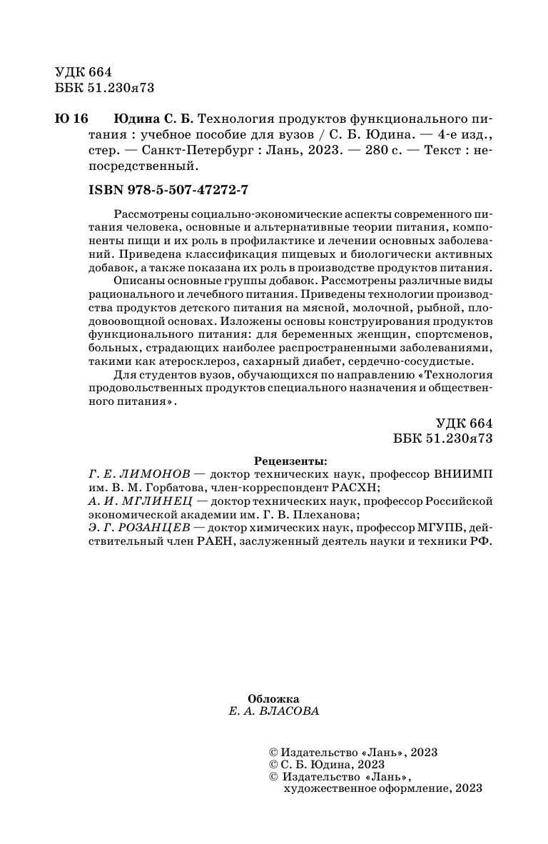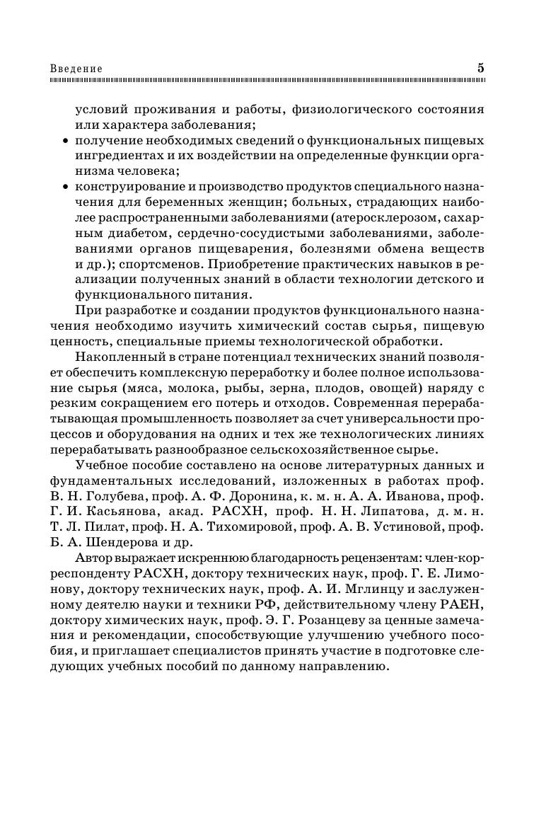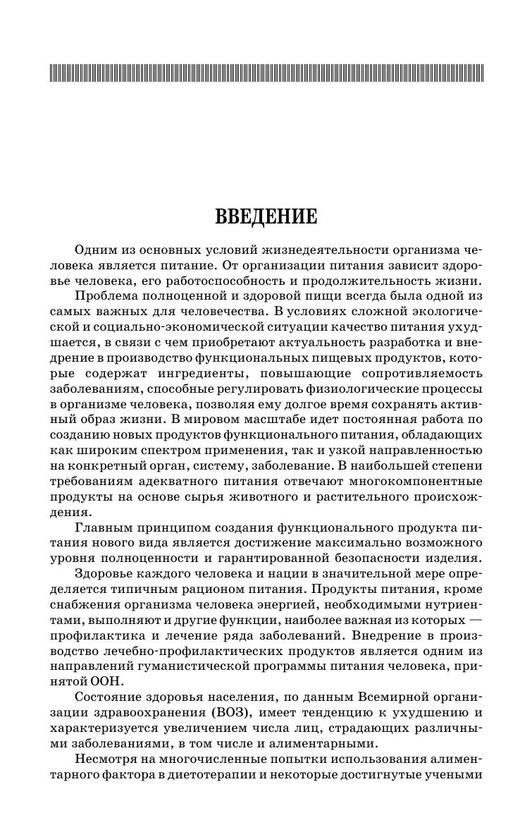 Рассмотрены социально-экономические аспекты современного питания человека, основные и альтернативные теории питания, компоненты пищи и их роль в профилактике и лечении основных заболеваний. Приведена классификация пищевых и биологически активных добавок, а также показана их роль в производстве продуктов питания. Описаны основные группы добавок. Рассмотрены различные виды рационального и лечебного питания. Приведены технологии производства продуктов детского питания на мясной, молочной, рыбной, плодовоовощной основах. Изложены основы конструирования продуктов функционального питания: для беременных женщин, спортсменов, больных, страдающих наиболее распространенными заболеваниями, такими как атеросклероз, сахарный диабет, сердечнососудистые. Для студентов вузов, обучающихся по направлению «Технология продовольственных продуктов специального назначения и общественного питания».