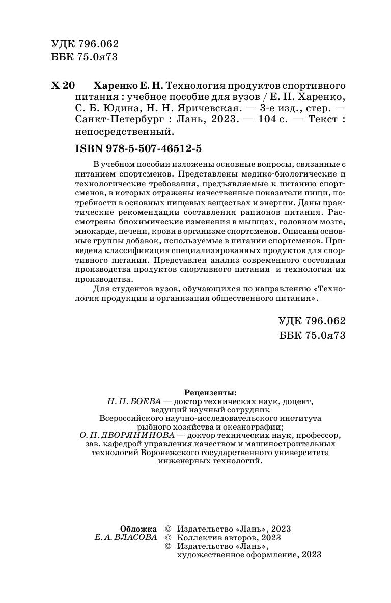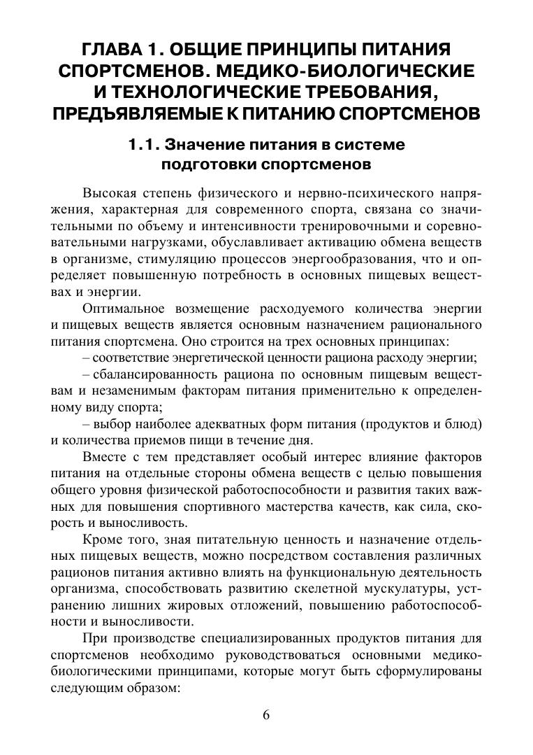 В учебном пособии изложены основные вопросы, связанные с питанием спортсменов. Представлены медико-биологические и технологические требования, предъявляемые к питанию спортсменов, в которых отражены качественные показатели пищи, потребности в основных пищевых веществах и энергии. Даны практические рекомендации составления рационов питания. Рассмотрены биохимические изменения в мышцах, головном мозге, миокарде, печени, крови в организме спортсменов. Описаны основные группы добавок, используемые в питании спортсменов. Приведена классификация специализированных продуктов для спортивного питания. Представлен анализ современного состояния производства продуктов спортивного питания и технологии их производства. Для студентов вузов, обучающихся по направлению «Технология продукции и организация общественного питания».