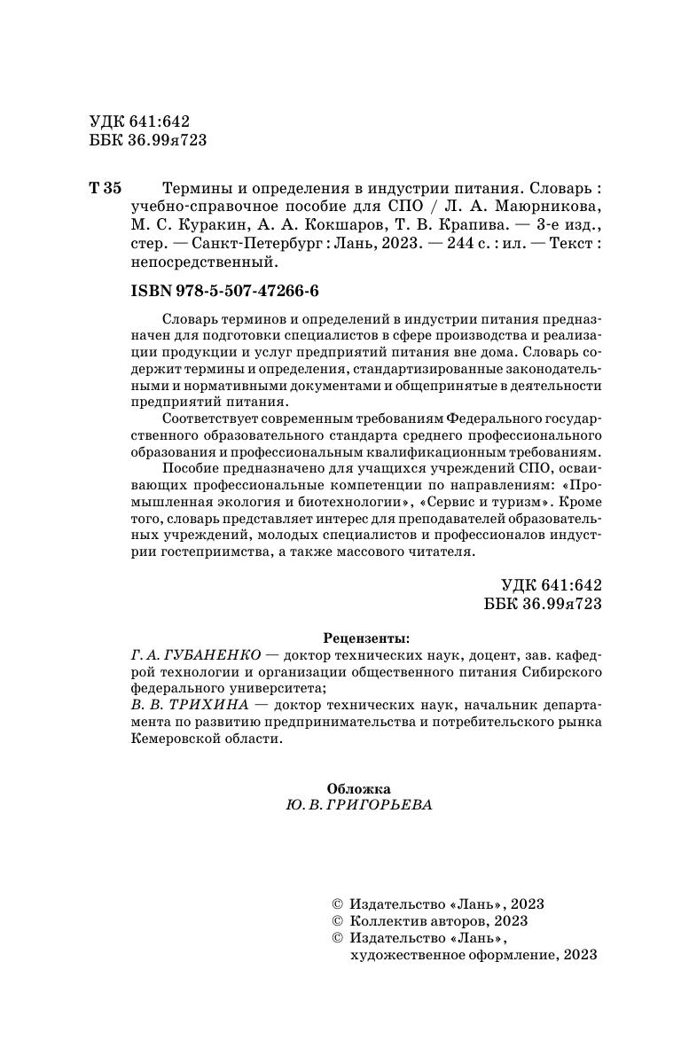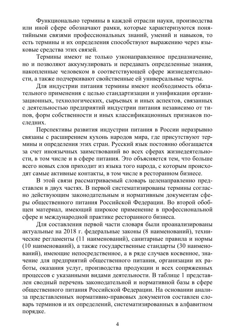 Словарь терминов и определений в индустрии питания предназначен для подготовки специалистов в сфере производства и реализации продукции и услуг предприятий питания вне дома. Словарь содержит термины и определения, стандартизированные законодательными и нормативными документами и общепринятые в деятельности предприятий питания. Соответствует современным требованиям Федерального государственного образовательного стандарта среднего профессионального образования и профессиональным квалификационным требованиям. Пособие предназначено для учащихся учреждений СПО, осваивающих профессиональные компетенции по направлениям: «Промышленная экология и биотехнологии», «Сервис и туризм». Кроме того, словарь представляет интерес для преподавателей образовательных учреждений, молодых специалистов и профессионалов индустрии гостеприимства, а также массового читателя.