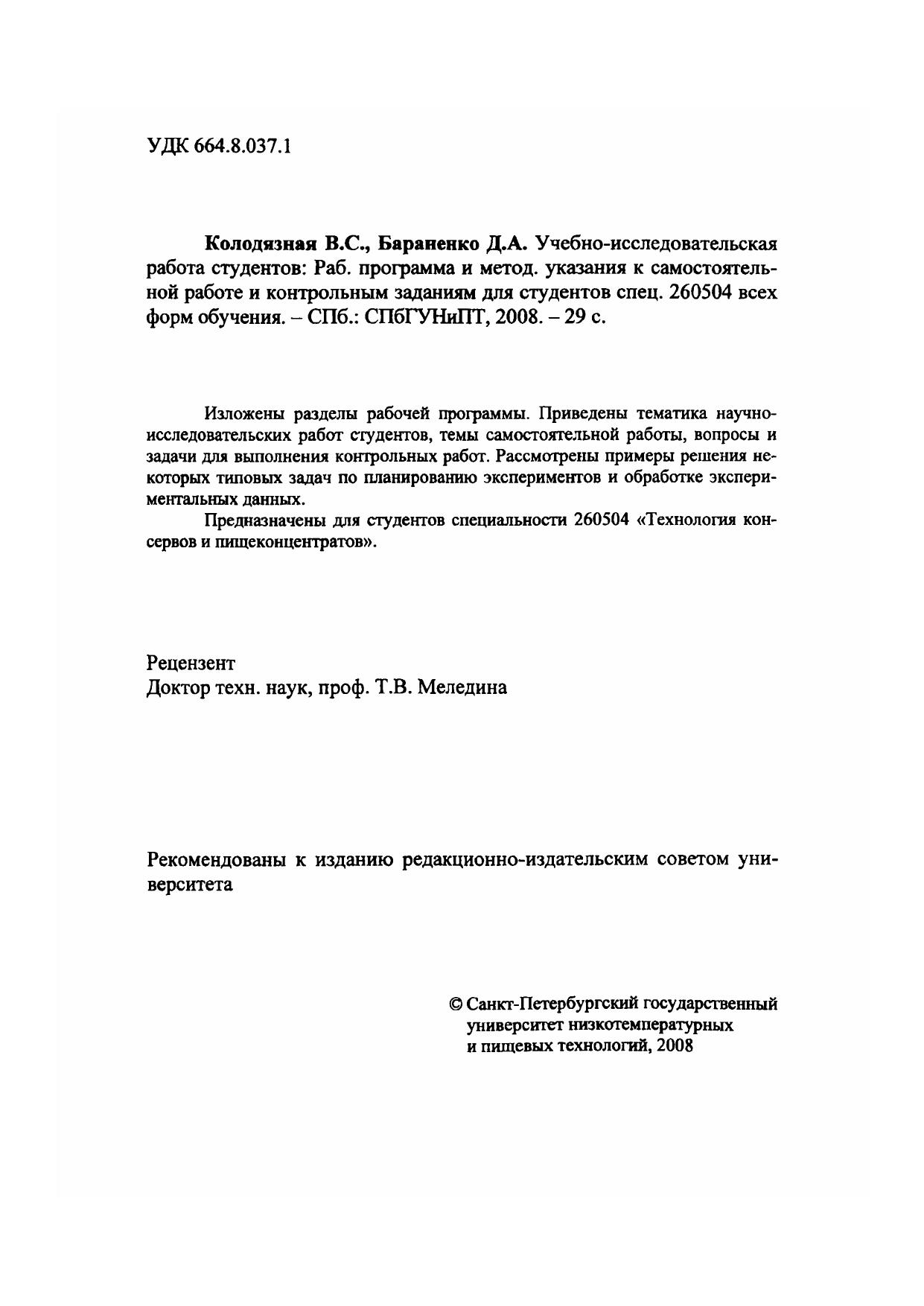 Учебно-исследовательская работа студентов: Рабочая программа и метод, указания к самостоятельной работе и контрольным заданиям для студентов спец. 260504 всех форм обучения