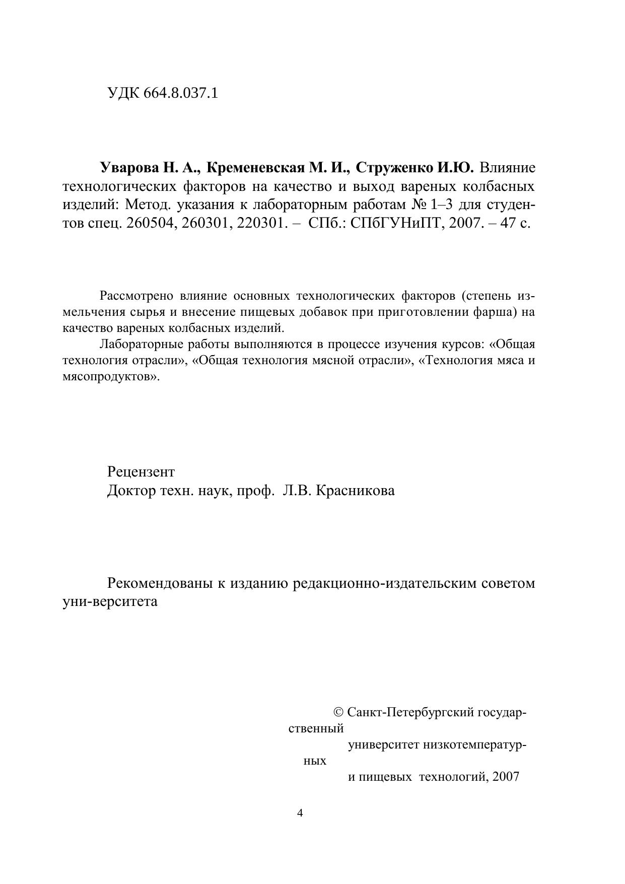 Влияние технологических факторов на качество и выход вареных колбасных изделий: Методические указания к лабораторным работам № 1–3 для студентов спец. 260504, 260301, 220301