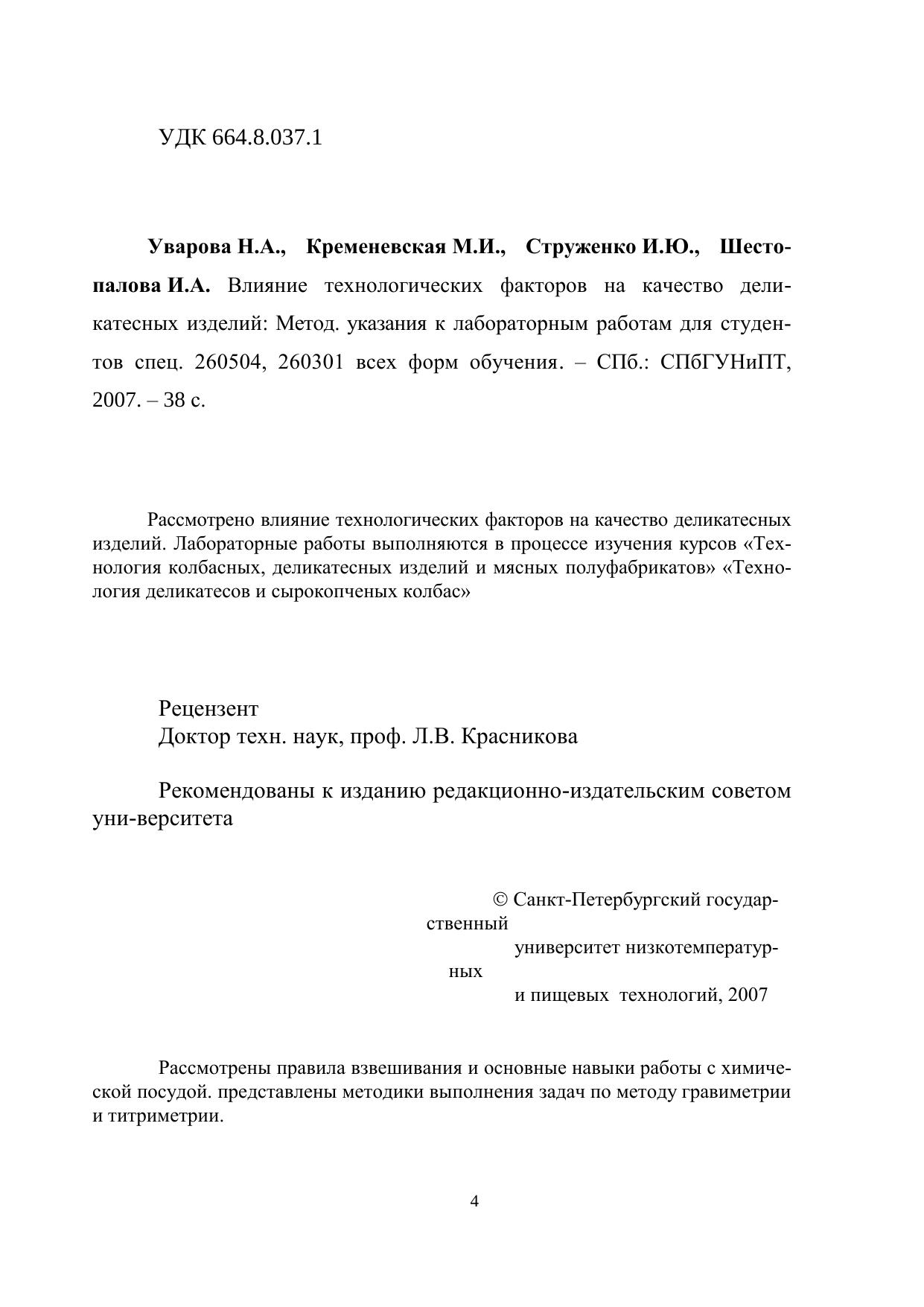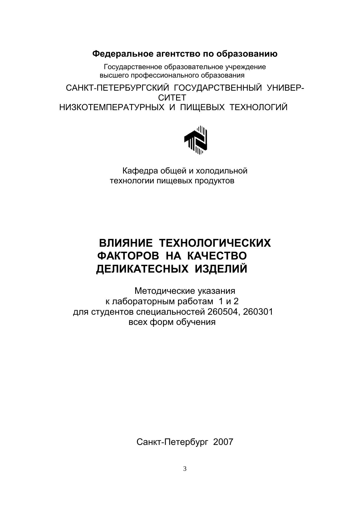 Влияние технологических факторов на качество деликатесных изделий: Методические указания к лабораторным работам для студентов спец. 260504, 260301 всех форм обучения
