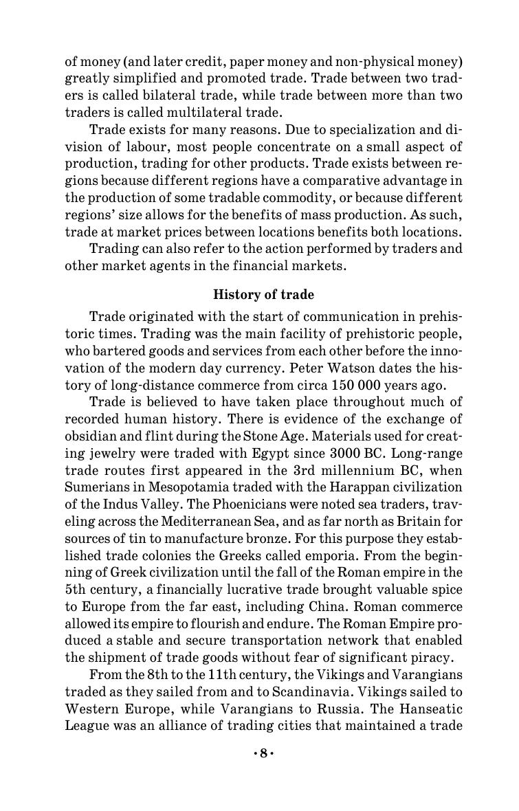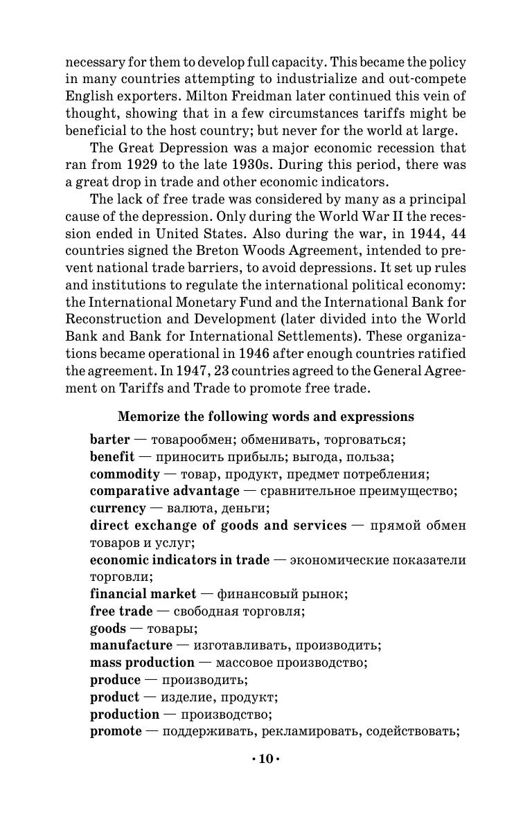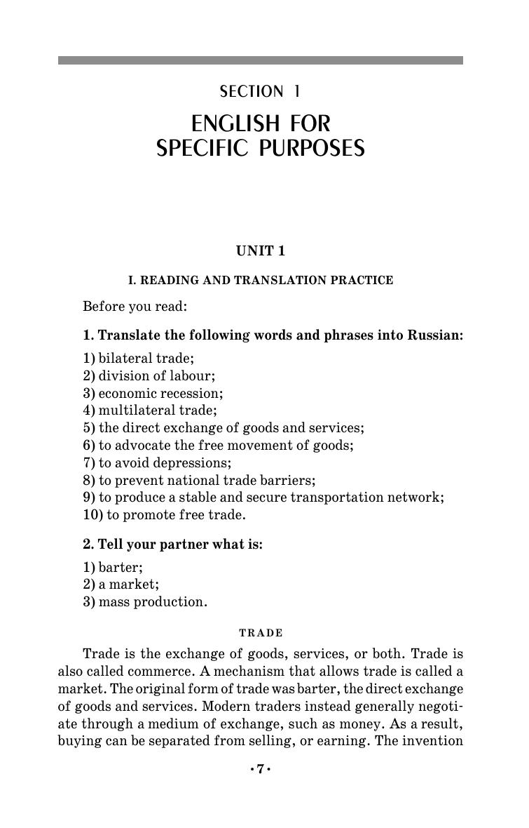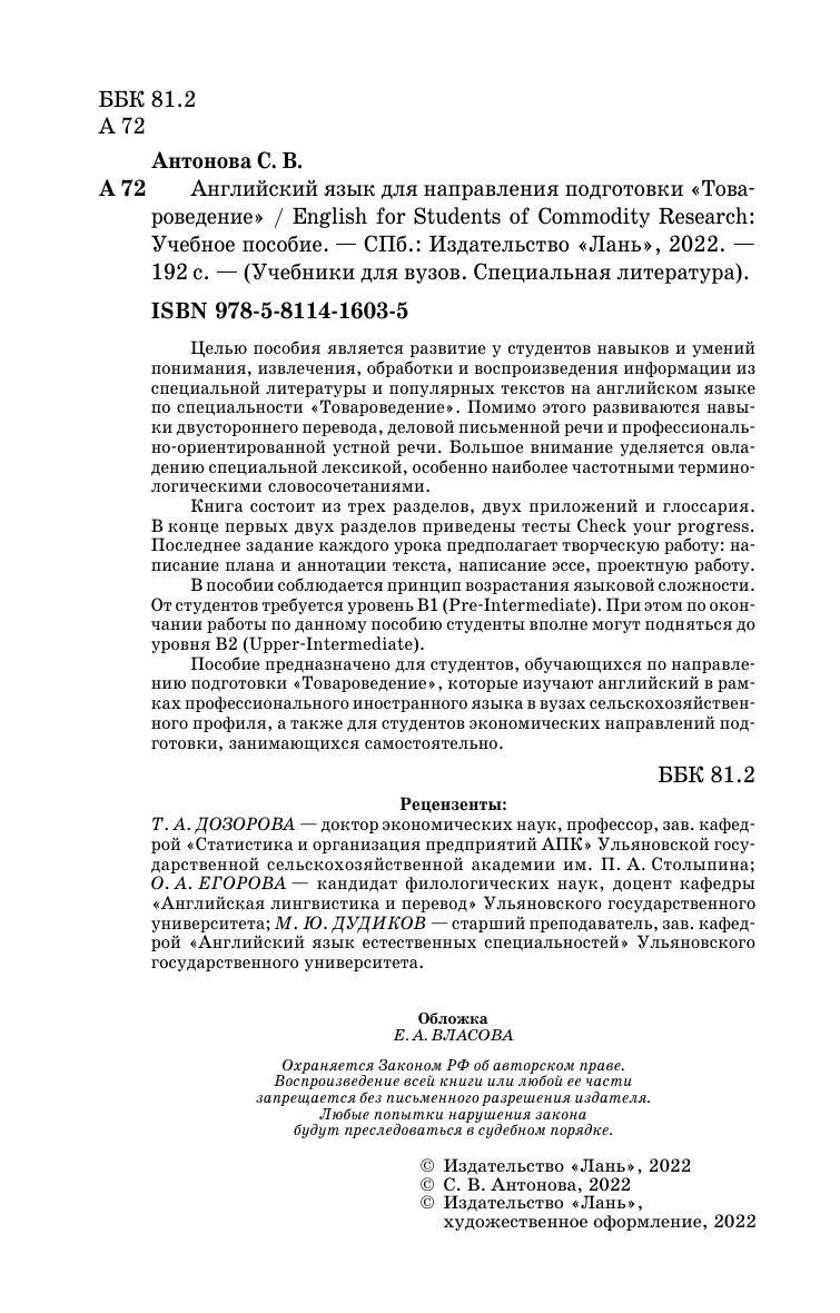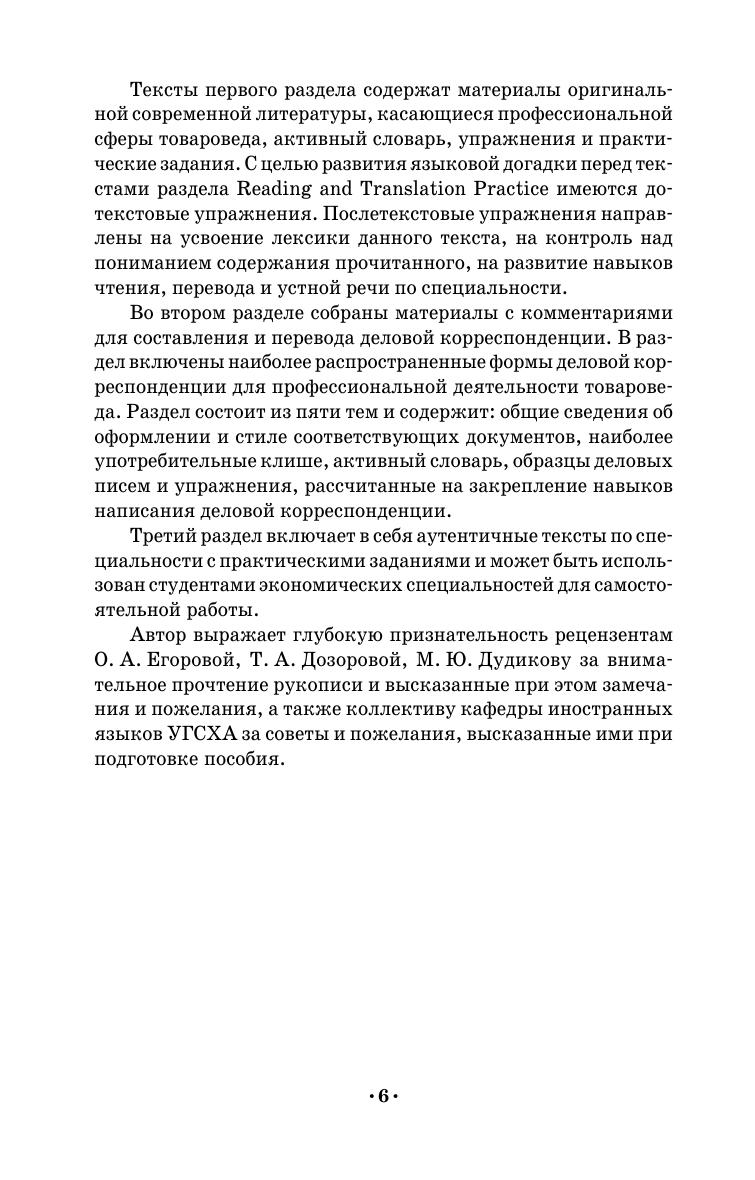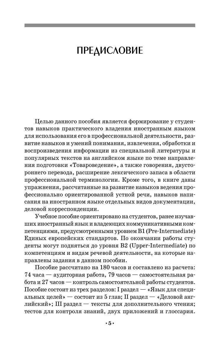 Пособие предназначено для студентов старших курсов, обучающихся по направлению подготовки «Товароведение», которые изучают английский в рамках профессионального иностранного языка в вузах сельскохозяйственного профиля, а также для студентов экономических специальностей, занимающихся самостоятельно. Целью пособия является развитие у студентов навыков и умений понимания, извлечения, обработки и воспроизведения информации из специальной литературы и популярных текстов на английском языке по специальности «Товароведение». Помимо этого развиваются навыки двустороннего перевода, деловой письменной речи и профессионально-ориентированной устной речи. Большое внимание уделяется овладению специальной лексикой, особенно наиболее частотными терминологическими словосочетаниями. Книга состоит из трех разделов, двух приложений и глоссария. В конце первых двух разделов приведены тесты Check your progress. Последнее задание каждого урока предполагает творческую работу: написание плана и аннотации текста, написание эссе, проектную работу. В пособии соблюдается принцип возрастания языковой сложности. От студентов требуется уровень В1 (Pre-Intermediate). При этом по окончании работы по данному пособию студенты вполне могут подняться до уровня В2 (Upper-Intermediate).