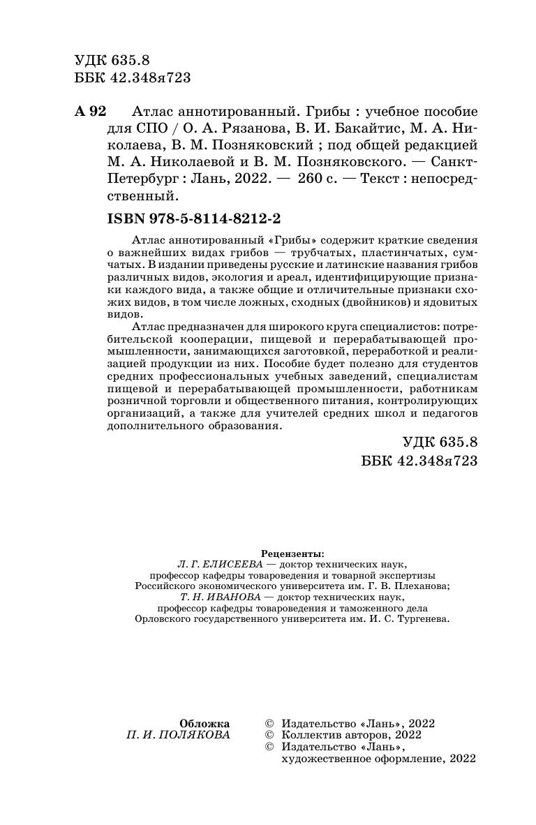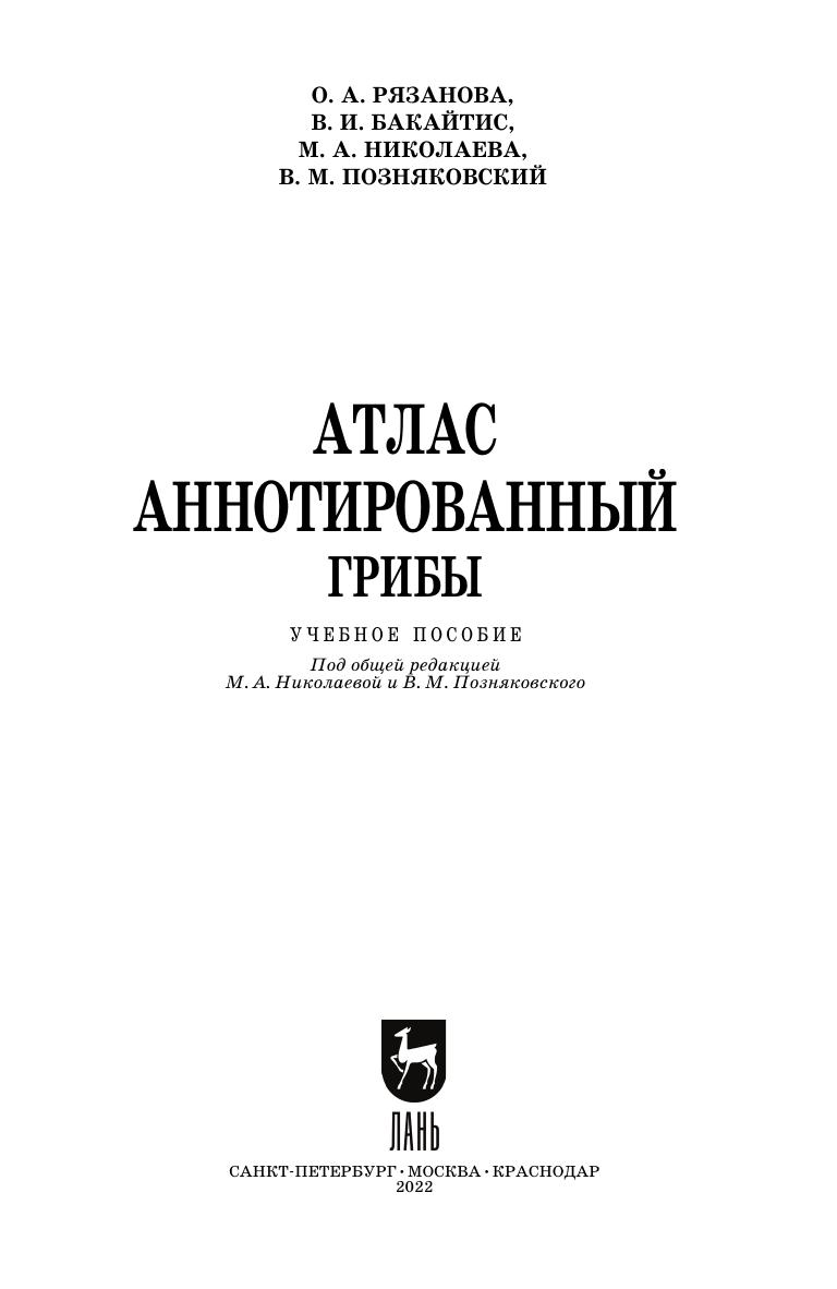 Атлас аннотированный «Грибы» содержит краткие сведения о важнейших видах грибов — трубчатых, пластинчатых, сумчатых. В издании приведены русские и латинские названия грибов различных видов, экология и ареал, идентифицирующие признаки каждого вида, а также общие и отличительные признаки схожих видов, в т. ч. ложных, сходных (двойников) и ядовитых видов.
