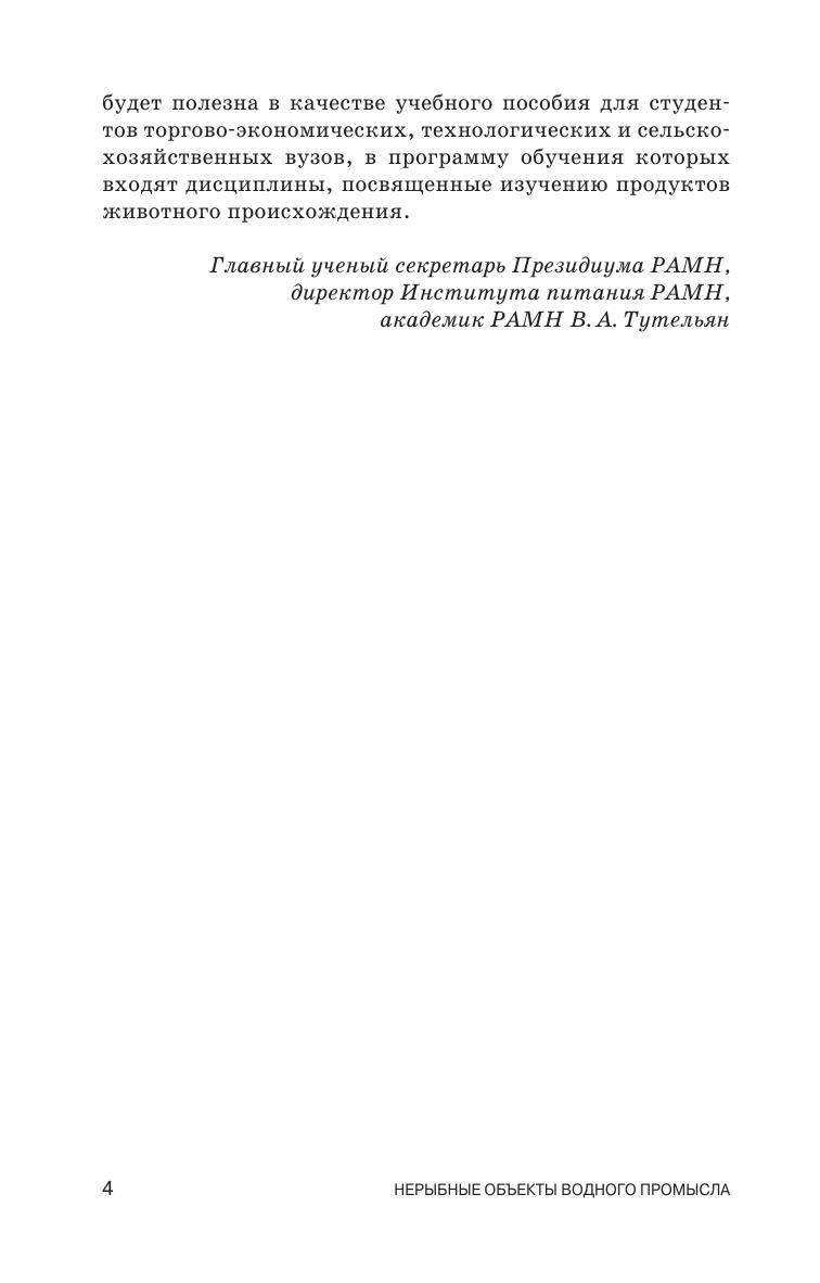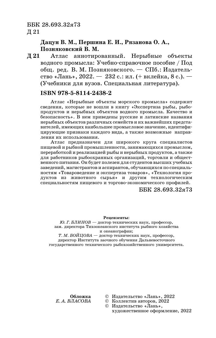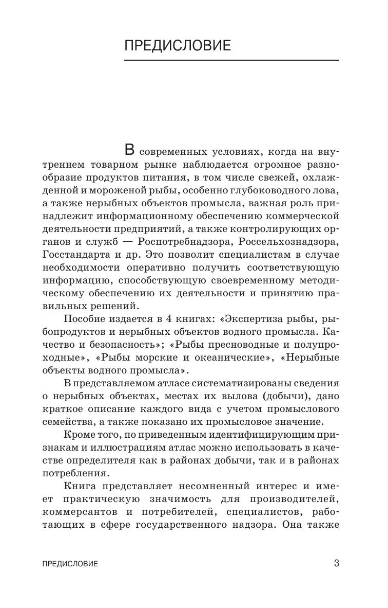 Атлас «Нерыбные объекты морского промысла» содержит сведения, которые не вошли в книгу «Экспертиза рыбы, рыбопродуктов и нерыбных объектов водного промысла. Качество и безопасность» (2016). В нем приведены русские и латинские нерыбных объектов различных семейств и их важнейших представителей, имеющих наибольшее промысловое значение, идентифицирующие признаки каждого вида, а также возможные направления их использования. Атлас предназначен для широкого круга специалистов пищевой и рыбной промышленности, занимающихся промыслом, переработкой и реализацией рыбы и нерыбных продуктов, а также для работников рыбоохранных организаций, торговли и общественного питания. Он будет полезен для студентов высших учебных заведений, магистрантов и аспирантов, обучающихся по специальности «Товароведение и экспертиза товаров», «Технология продуктов из животного сырья» и другим технологическим специальностям пищевого и торгово-экономического профилей.