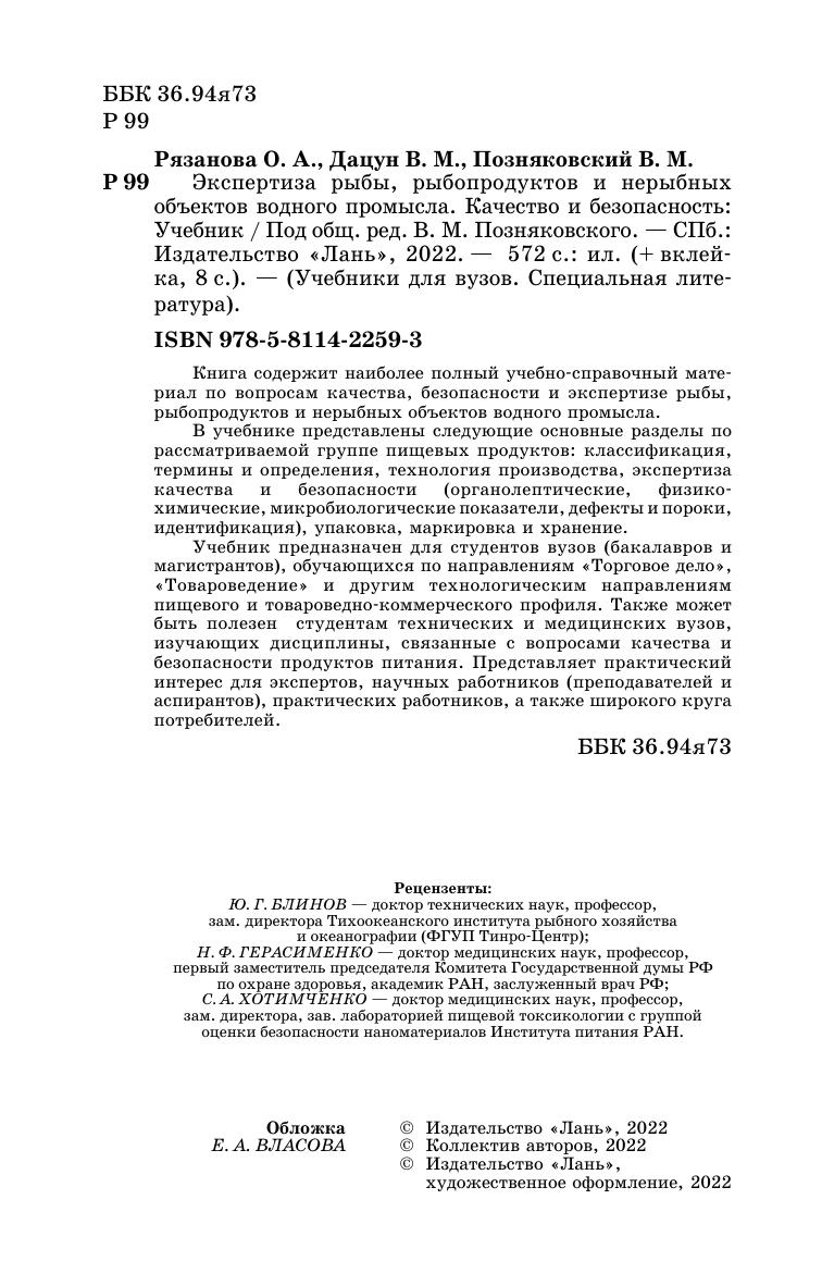 Книга содержит наиболее полный учебно-справочный материал по вопросам качества, безопасности и экспертизе рыбы, рыбопродуктов и нерыбных объектов водного промысла. В учебнике представлены следующие основные разделы по рассматриваемой группе пищевых продуктов: классификация, термины и определения, технология производства, экспертиза качества и безопасности (органолептические, физико-химические, микробиологические показатели, дефекты и пороки, идентификация), упаковка, маркировка и хранение. Учебник предназначен для студентов ввузов (бакалавров и магистрантов), обучающихся по направлению «Товароведение» и другим технологическим направлениям пищевого и товароведно-коммерческого профиля. Также может быть полезен студентам технических и медицинских вузов, изучающих дисциплины, связанные с вопросами качества и безопасности продуктов питания. Представляет практический интерес для экспертов, научных работников (преподавателей и аспирантов), практических работников, а также широкого круга потребителей.