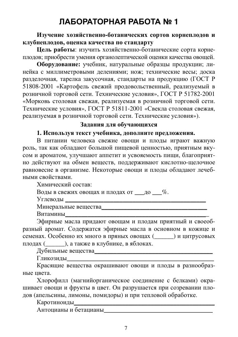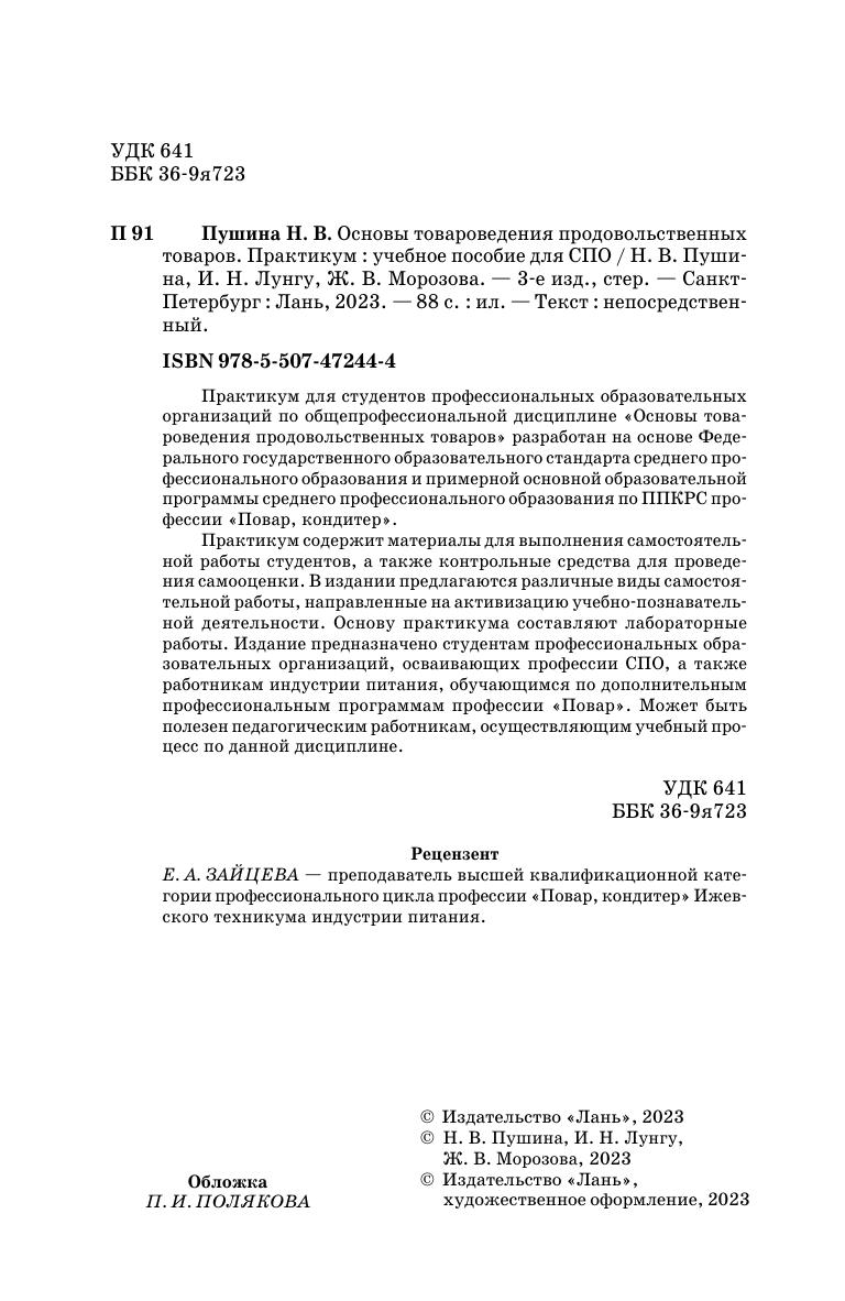 Практикум для студентов профессиональных образовательных организаций по общепрофессиональной дисциплине «Основы товароведения продовольственных товаров» разработан на основе Федерального государственного образовательного стандарта среднего профессионального образования и примерной основной образовательной программы среднего профессионального образования по ППКРС профессии «Повар, кондитер». Практикум содержит материалы для выполнения самостоятельной работы студентов, а также контрольные средства для проведения самооценки. В издании предлагаются различные виды самостоятельной работы, направленные на активизацию учебно познавательной деятельности. Основу практикума составляют лабораторные работы. Соответствует современным требованиям Федерального государственного образовательного стандарта среднего профессионального образования и профессиональным квалификационным требованиям. Издание предназначено студентам профессиональных образовательных организаций, осваивающих профессии СПО, а также работникам индустрии питания, обучающимся по дополнительным профессиональным программам профессии «Повар». Может быть полезен педагогическим работникам, осуществляющим учебный процесс по данной дисциплине.