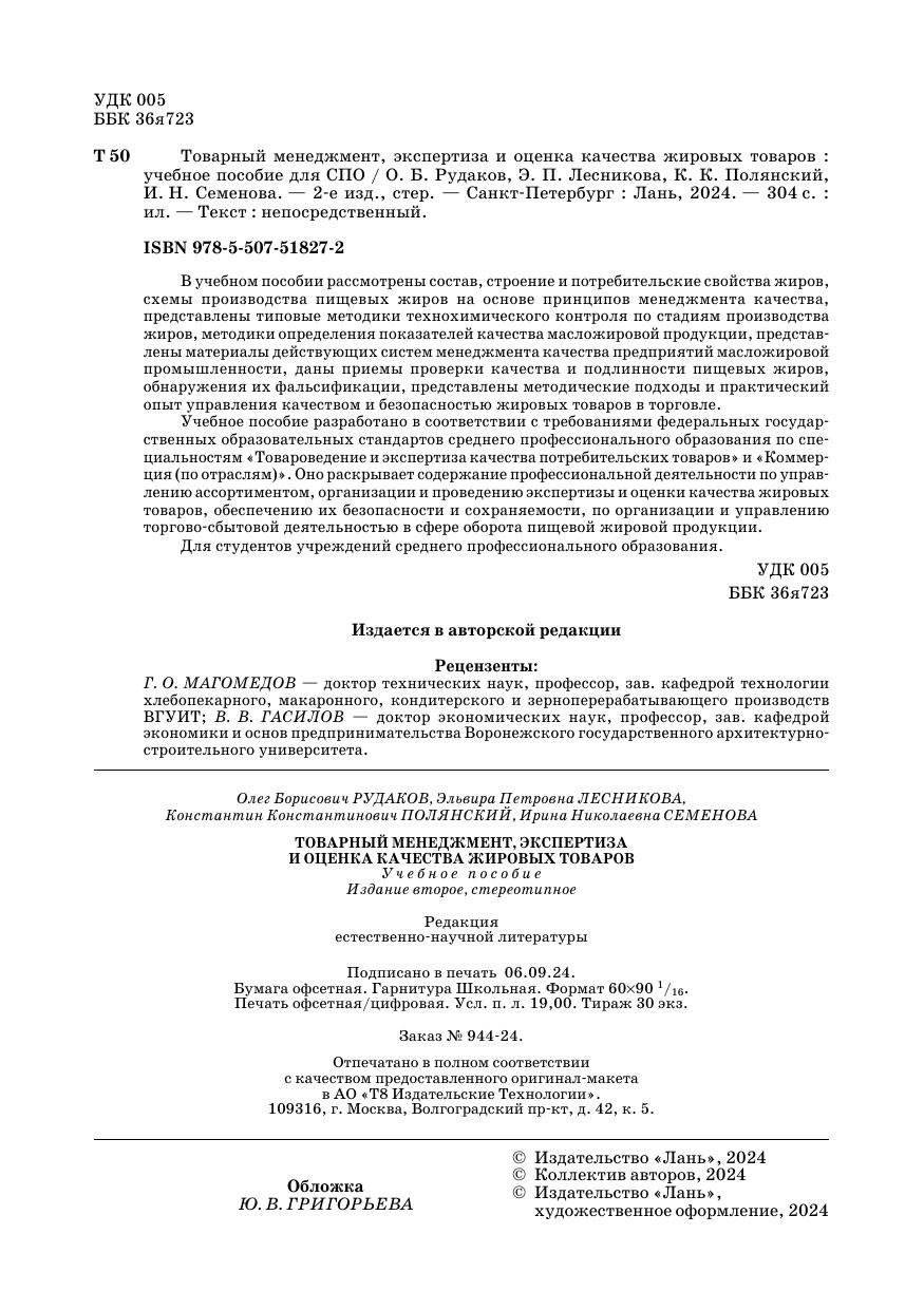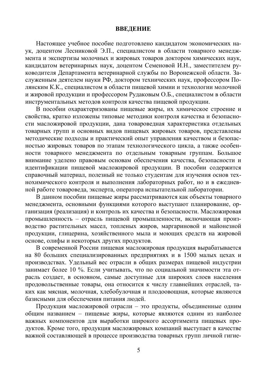 В учебном пособии рассмотрены состав, строение и потребительские свойства жиров, схемы производства пищевых жиров на основе принципов менеджмента качества, представлены типовые методики технохимического контроля по стадиям производства жиров, методики определения показателей качества масложировой продукции, представлены материалы действующих систем менеджмента качества предприятий масложировой промышленности, даны приемы проверки качества и подлинности пищевых жиров, обнаружения их фальсификации, представлены методические подходы и практический опыт управления качеством и безопасностью жировых товаров в торговле. Учебное пособие разработано в соответствии с требованиями федеральных государственных образовательных стандартов среднего профессионального образования по специальностям «Товароведение и экспертиза качества потребительских товаров» и «Коммерция (по отраслям)». Оно раскрывает содержание профессиональной деятельности по управлению ассортиментом, организации и проведению экспертизы и оценки качества жировых товаров, обеспечению их безопасности и сохраняемости, по организации и управлению торгово-сбытовой деятельностью в сфере оборота пищевой жировой продукции. Для студентов учреждений среднего профессионального образования.