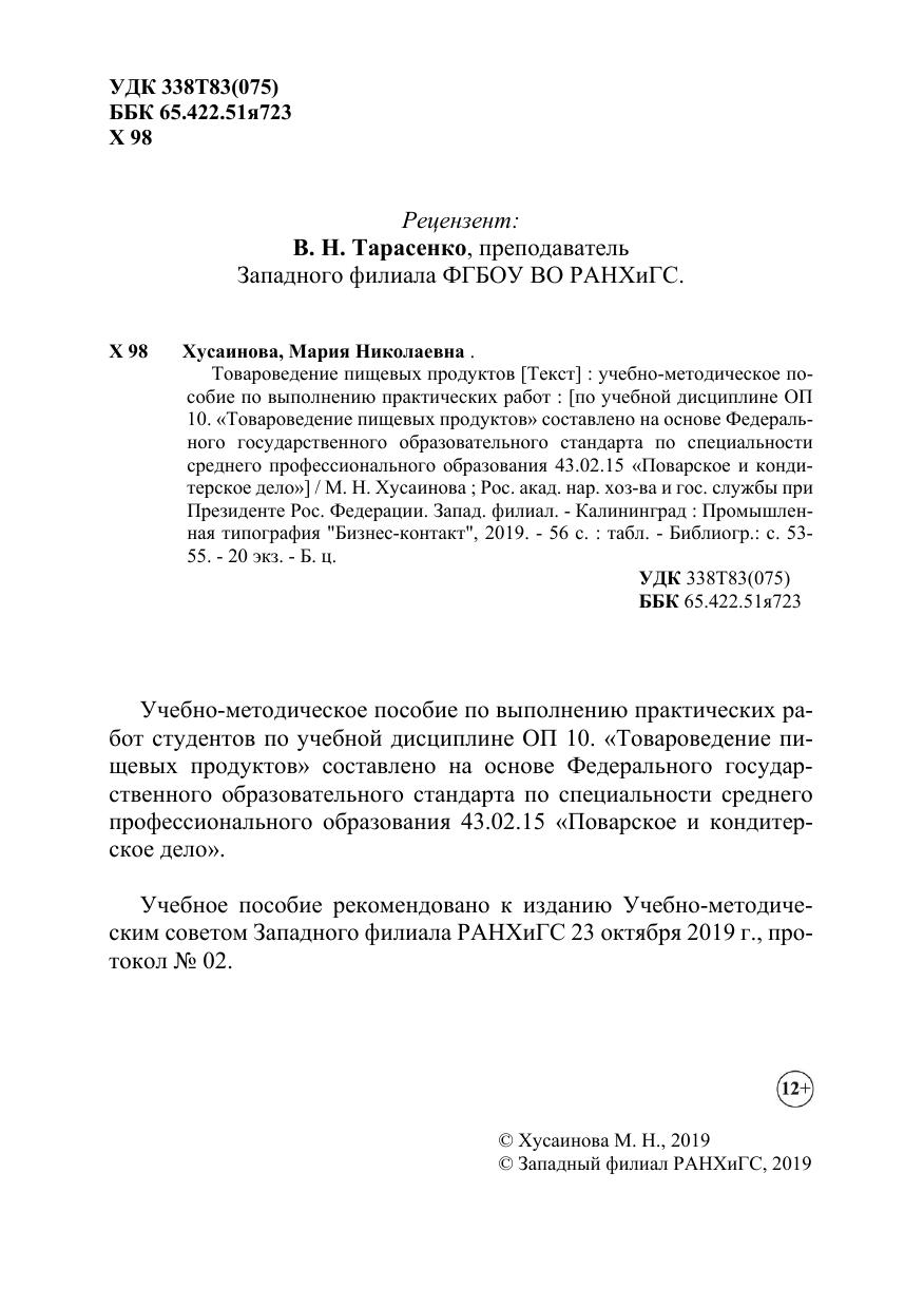 Учебно-методическое пособие по выполнению практических работ студентов по учебной дисциплине ОП 10. «Товароведение пищевых продуктов» составлено на основе Федерального государственного образовательного стандарта по специальности среднего профессионального образования 43.02.15 «Поварское и кондитерское дело».