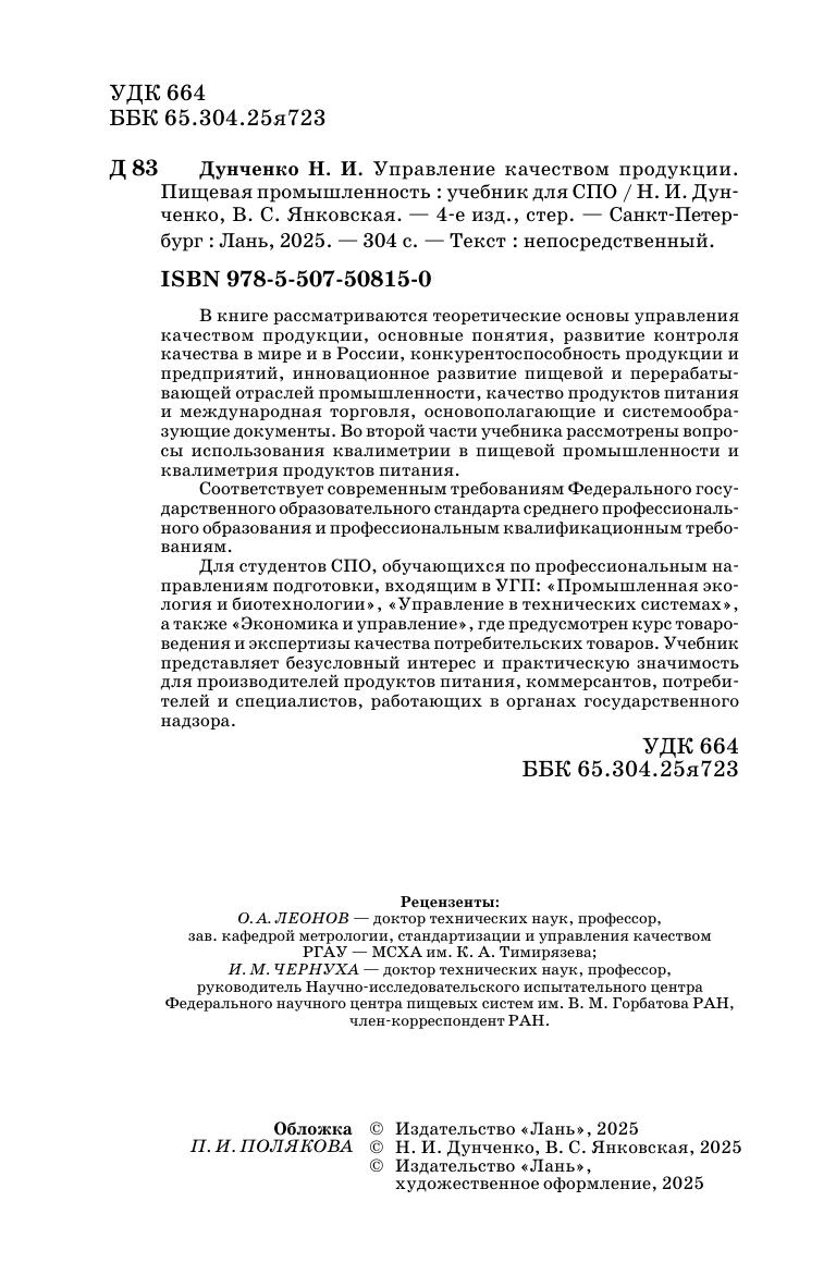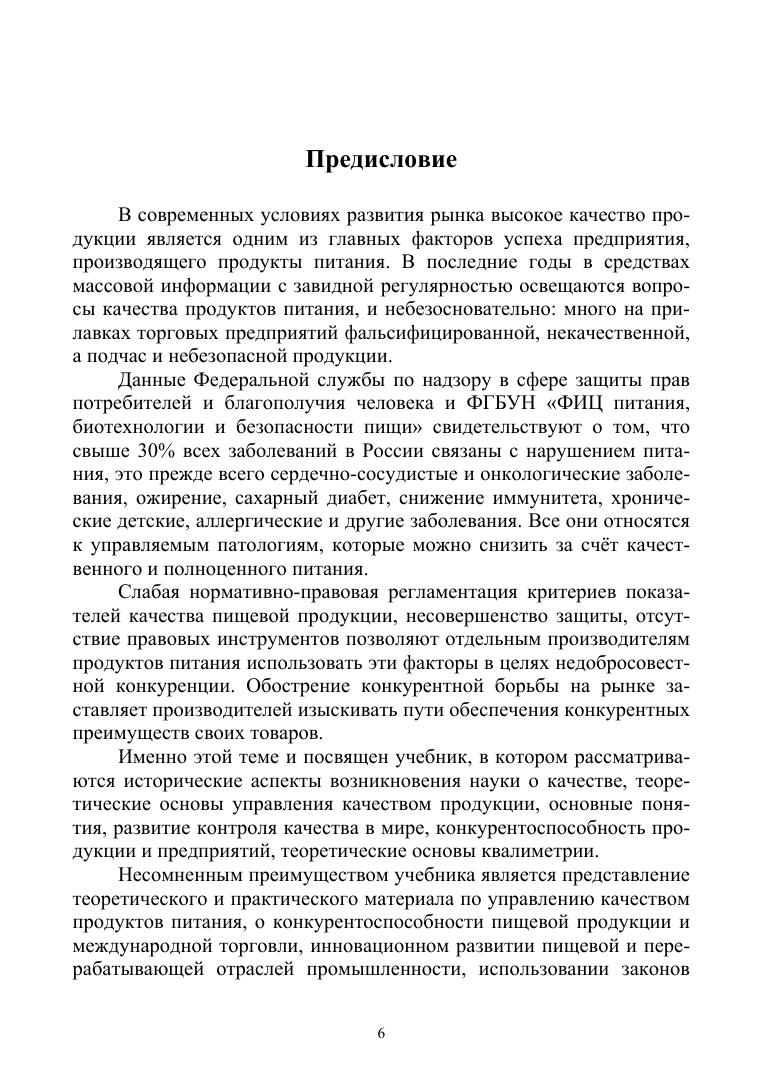 В книге рассматриваются теоретические основы управления качеством продукции, основные понятия, развитие контроля качества в мире и в России, конкурентоспособность продукции и предприятий, инновационное развитие пищевой и перерабатывающих отраслей промышленности, качество продуктов питания и международная торговля, основополагающие и системообразующие документы. Во второй части учебника рассмотрены вопросы использования квалиметрии в пищевой промышленности и квалиметрия продуктов питания. Соответствует современным требованиям Федерального государственного образовательного стандарта среднего профессионального образования и профессиональным квалификационным требованиям. Для студентов СПО, обучающихся по профессиональным направлениям подготовки, входящим в УГП «Промышленная экология и биотехнологии», «Управление в технических системах», а также «Экономика и управление», где предусмотрен курс товароведения и экспертизы качества потребительских товаров. Учебник представляет безусловный интерес и практическую значимость для производителей продуктов питания, коммерсантов, потребителей, специалистов, работающих в органах государственного надзора.