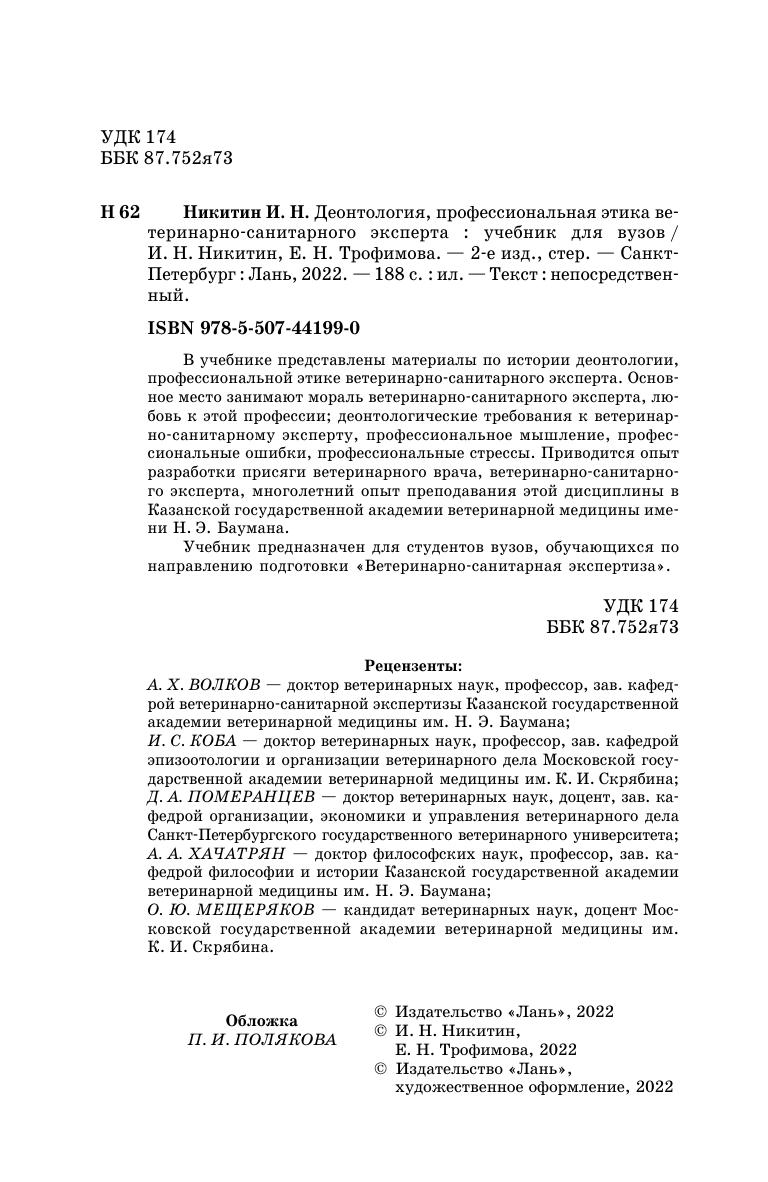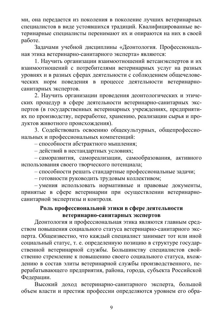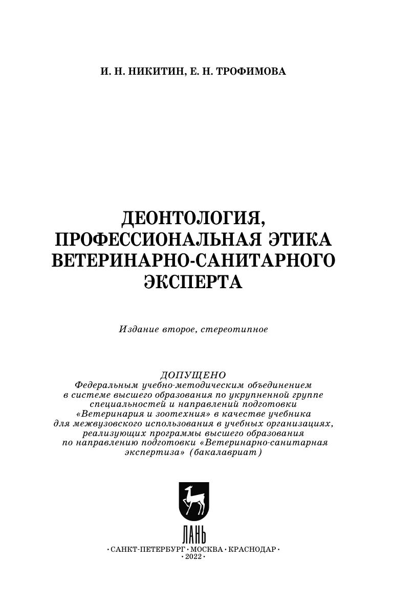 В учебнике представлены материалы по истории деонтологии, профессиональной этике ветеринарно санитарного эксперта. Основное место занимают мораль ветеринарно санитарного эксперта, любовь к этой профессии, деонтологические требования к ветеринарно-санитарному эксперту, профессиональное мышление, профессиональные ошибки, профессиональные стрессы. Приводится опыт разработки присяги ветеринарного врача, ветеринарно-санитарного эксперта, многолетний опыт преподавания этой дисциплины Казанской государственной академии ветеринарной медицины имени Н. Э. Баумана. Учебник предназначен для студентов вузов, обучающихся по направлению подготовки «Ветеринарно-санитарная экспертиза».