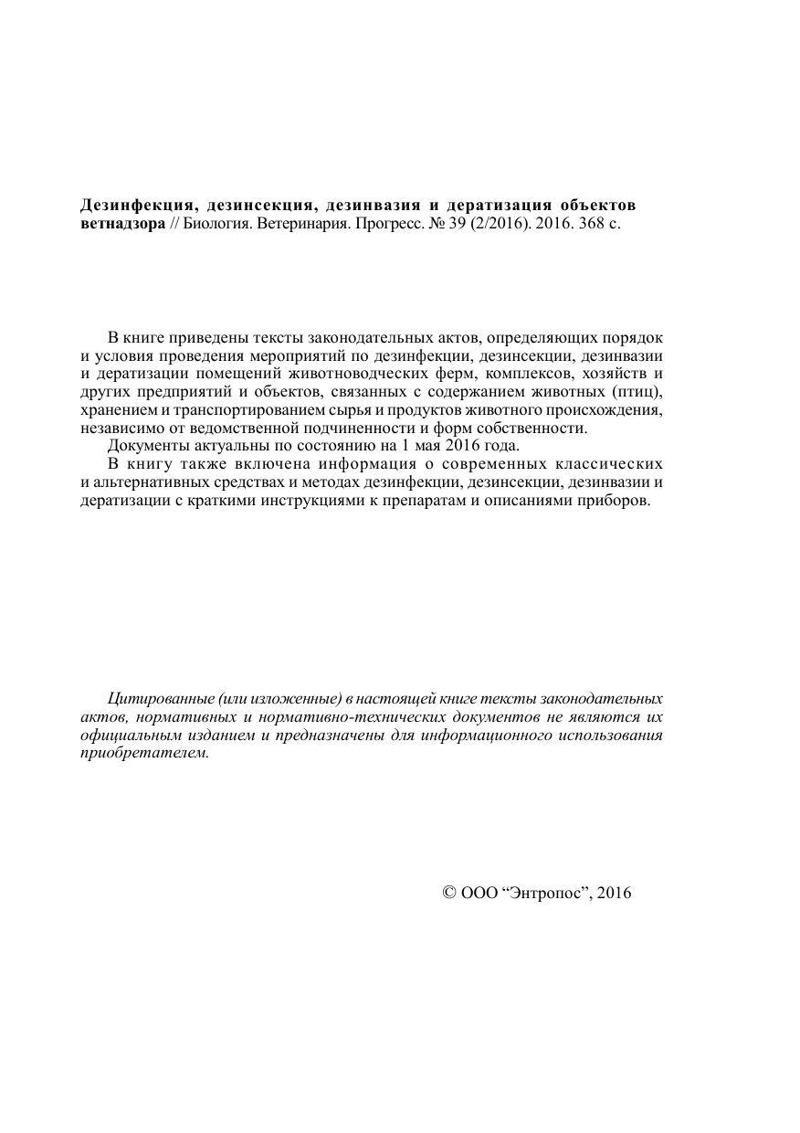 В книге приведены тексты законодательных актов, определяющих порядок и условия проведения мероприятий по дезинфекции, дезинсекции, дезинвазии и дератизации помещений животноводческих ферм, комплексов, хозяйств и других предприятий и объектов, связанных с содержанием животных (птиц), хранением и транспортированием сырья и продуктов животного происхождения, независимо от ведомственной подчиненности и форм собственности.