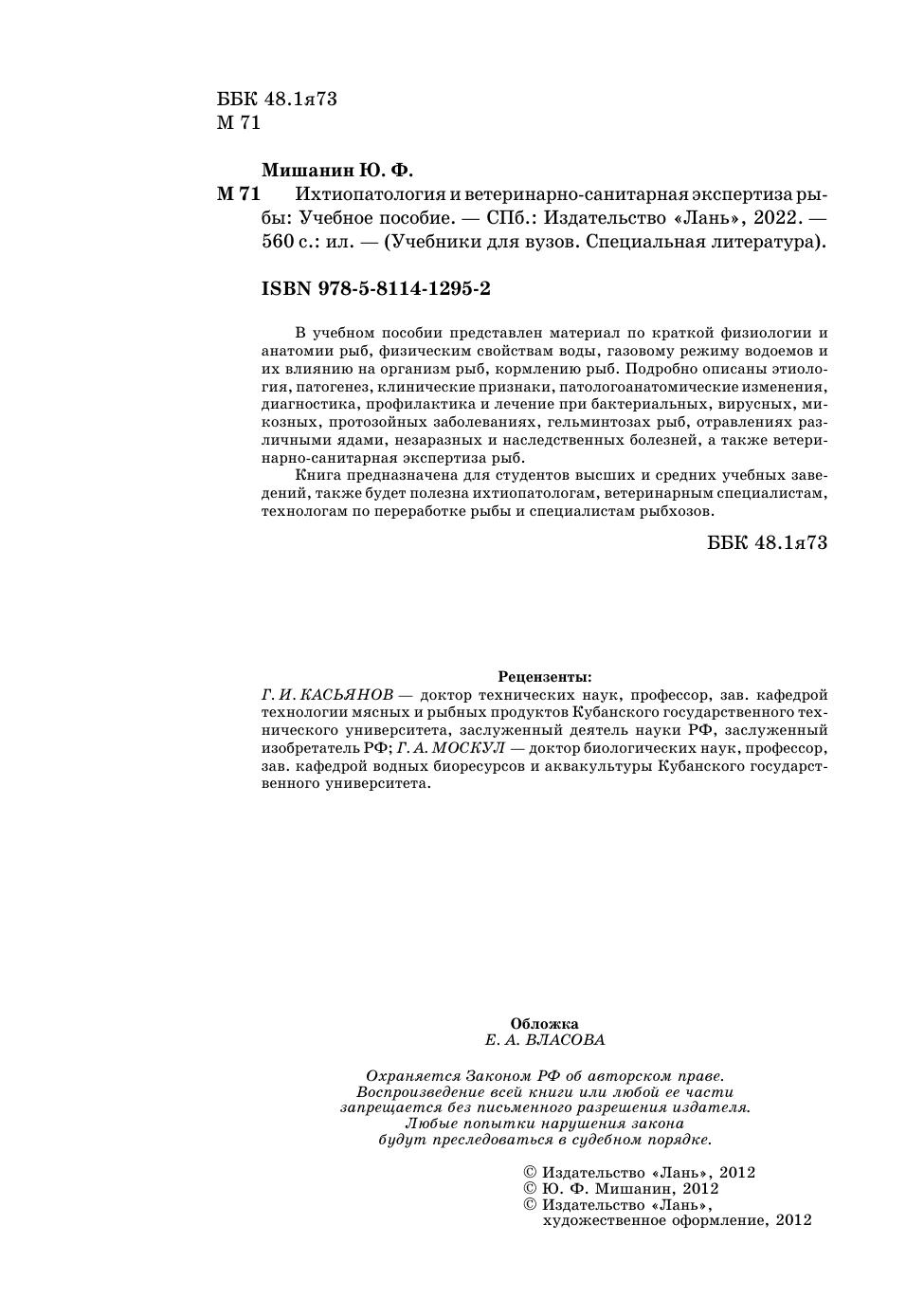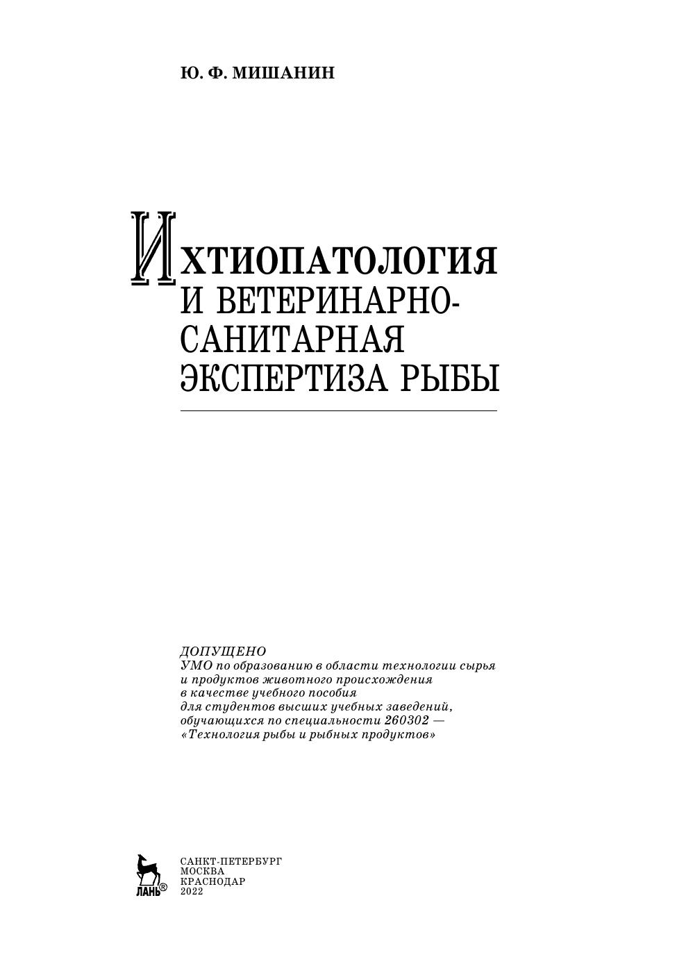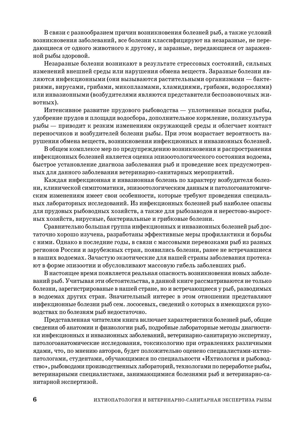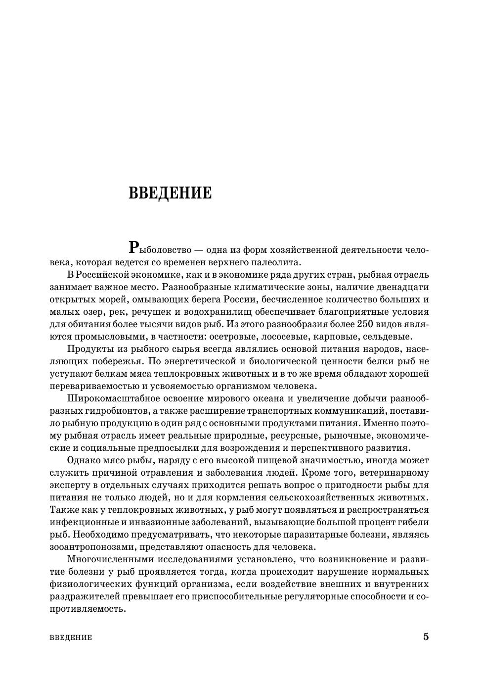 В учебном пособии представлен материал по краткой физиологии и анатомии рыб, физическим свойствам воды, газовому режиму водоемов и их влиянию на организм рыб, кормлению рыб. Подробно описаны этиология, патогенез, клинические признаки, патологоанатомические изменения, диагностика, профилактика и лечение при бактериальных, вирусных, микозных, протозойных заболеваниях, гельминтозах рыб, отравлениях различными ядами, незаразных и наследственных болезней, а также ветеринарно-санитарная экспертиза рыб. Книга предназначена для студентов высших и средних учебных заведений, также будет полезна ихтиопатологам, ветеринарным специалистам, технологам по переработке рыбы и специалистам рыбхозов.