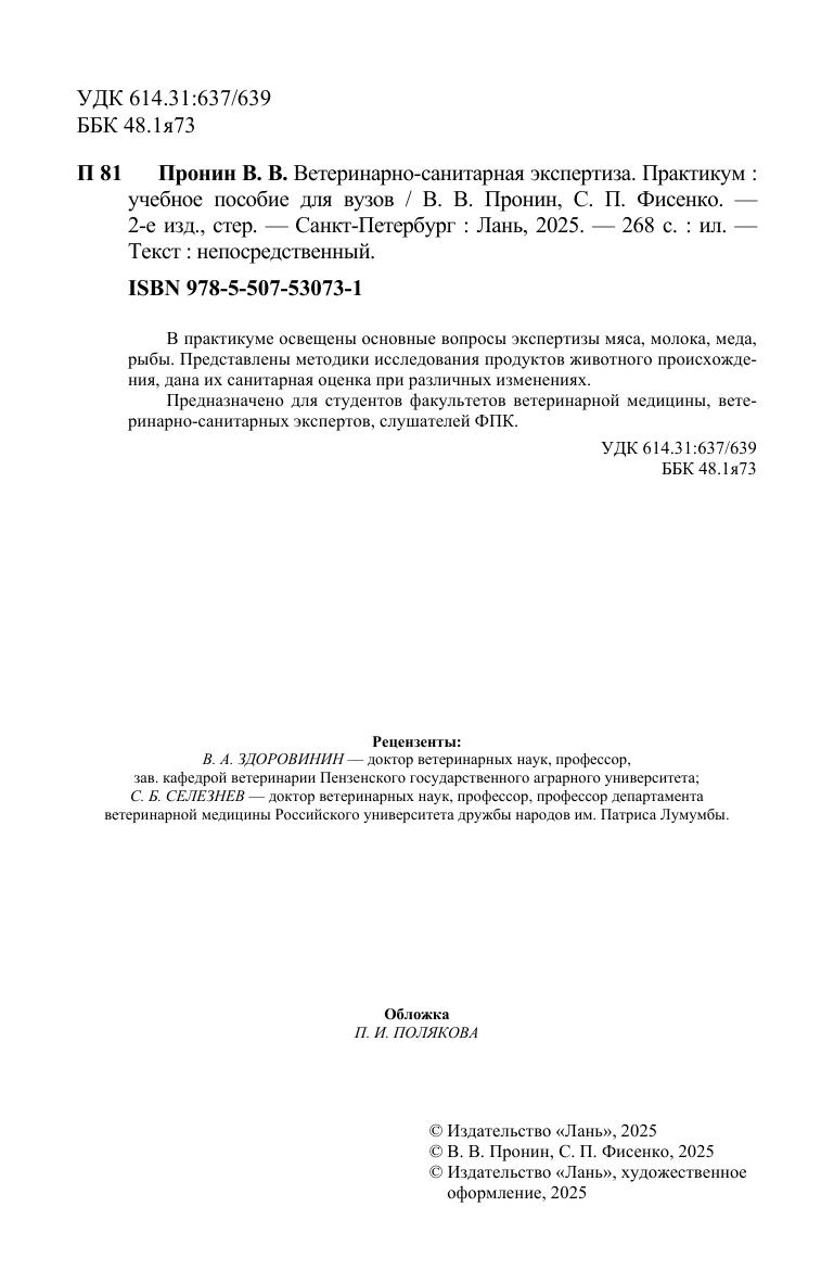 В практикуме освещены основные вопросы экспертизы мяса, молока, меда, рыбы. Представлены методики исследования продуктов животного происхождения, дана их санитарная оценка при различных изменениях. Предназначено для студентов факультетов ветеринарной медицины, ветеринарно-санитарных экспертов, слушателей ФПК.