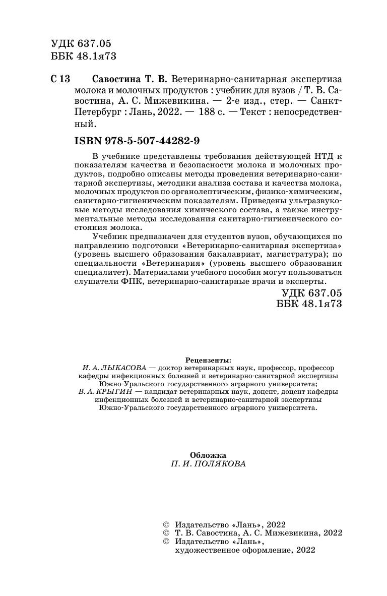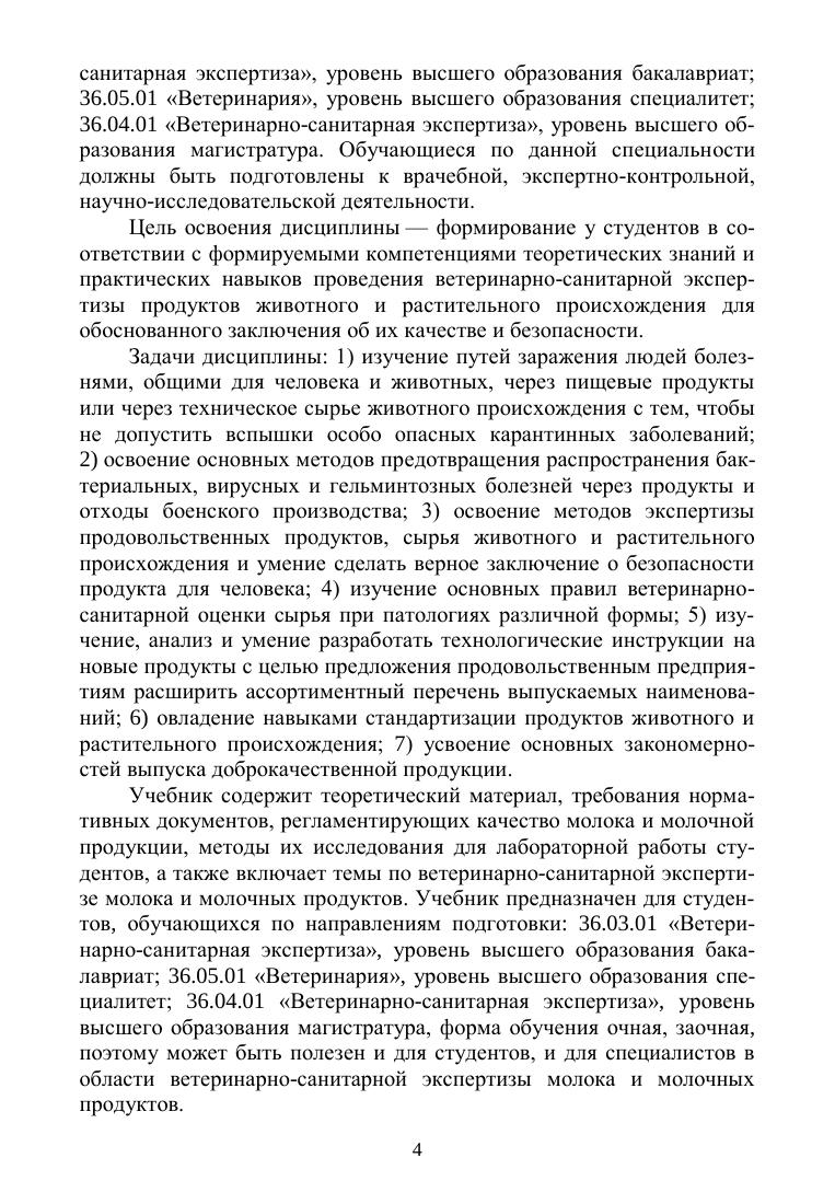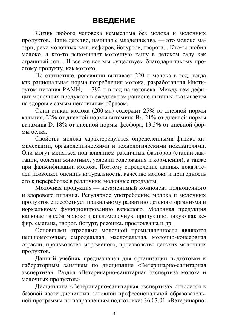 В учебнике представлены требования действующей НТД к показателям качества и безопасности молока и молочных про-дуктов, подробно описаны методы проведения ветеринарно-сани-тарной экспертизы, методики анализа состава и качества молока, молочных продуктов по органолептическим, физико-химическим, санитарно-гигиеническим показателям. Приведены ультразвуко-вые методы исследования химического состава, а также инстру-ментальные методы исследования санитарно-гигиенического со-стояния молока. Учебник предназначен для студентов, обучающихся по на-правлению подготовки Ветеринарно-санитарная экспертиза, уровень высшего образования бакалавриат, магистратура, по специальности Ветеринария, уровень высшего образования специалитет. Материалами учебного пособия могут пользоваться слушатели ФПК, ветеринарно-санитарные врачи и эксперты.