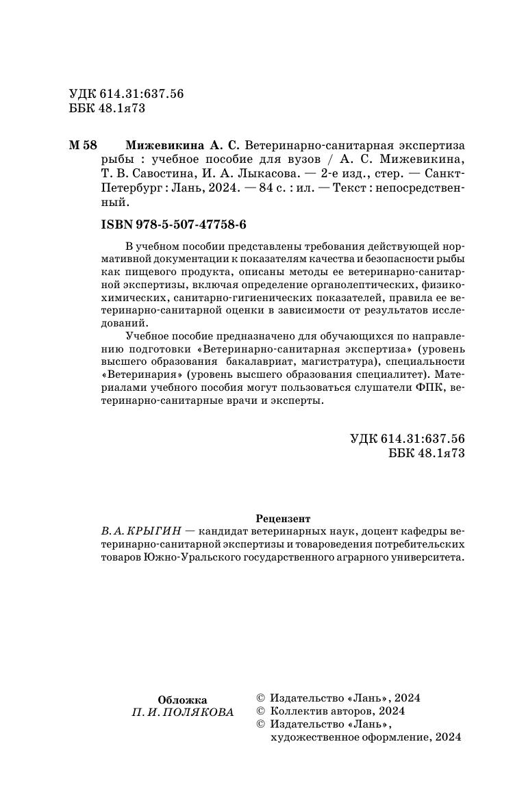 В учебном пособии представлены требования действующей нормативной документации к показателям качества и безопасности рыбы как пищевого продукта, описаны методы ее ветеринарно-санитарной экспертизы, включая определение органолептических, физико-химических, санитарно гигиенических показателей, правила ее ветеринарно-санитарной оценки в зависимости от результатов исследований. Учебное пособие предназначено для обучающихся по направлению подготовки Ветеринарно санитарная экспертиза, уровень высшего образования бакалавриат, магистратура, специальности Ветеринария, уровень высшего образования специалитет. Материалами учебного пособия могут пользоваться слушатели ФПК, ветеринарно санитарные врачи и эксперты.