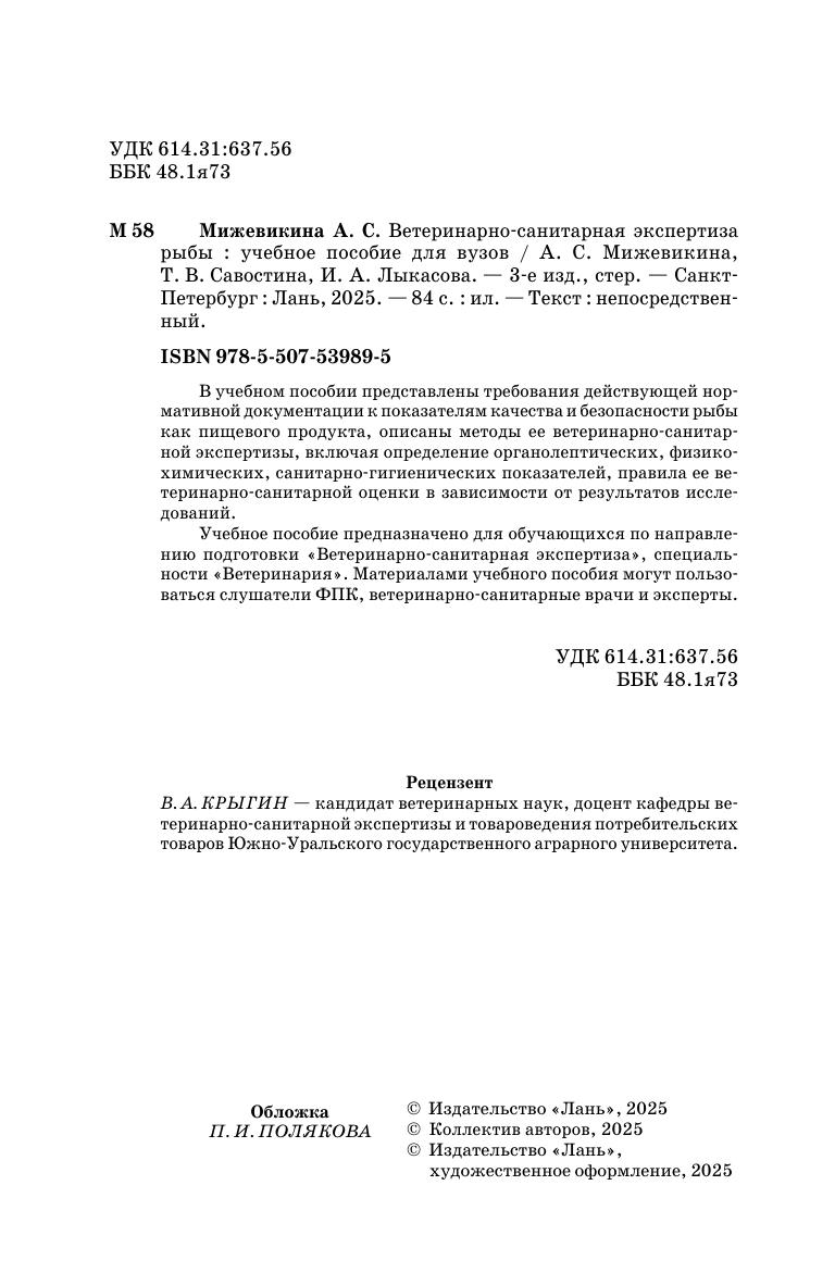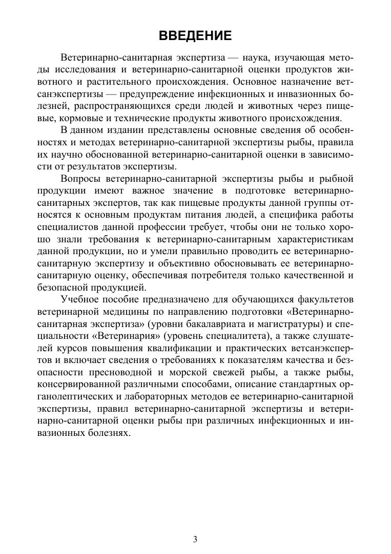 В учебном пособии представлены требования действующей нормативной документации к показателям качества и безопасности рыбы как пищевого продукта, описаны методы ее ветеринарно-санитарной экспертизы, включая определение органолептических, физико-химических, санитарно гигиенических показателей, правила ее ветеринарно-санитарной оценки в зависимости от результатов исследований. Учебное пособие предназначено для обучающихся по направлению подготовки «Ветеринарно санитарная экспертиза», специальности «Ветеринария». Материалами учебного пособия могут пользоваться слушатели ФПК, ветеринарно санитарные врачи и эксперты.