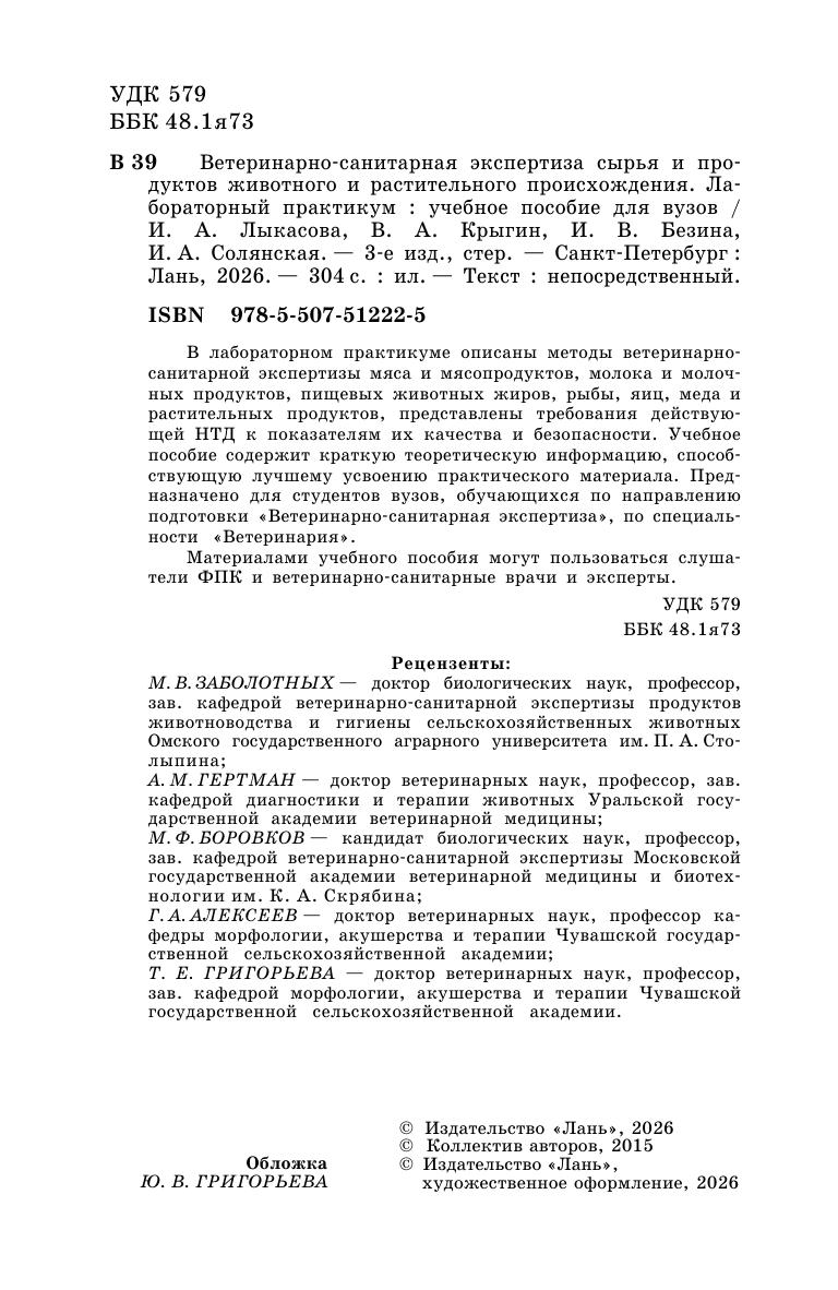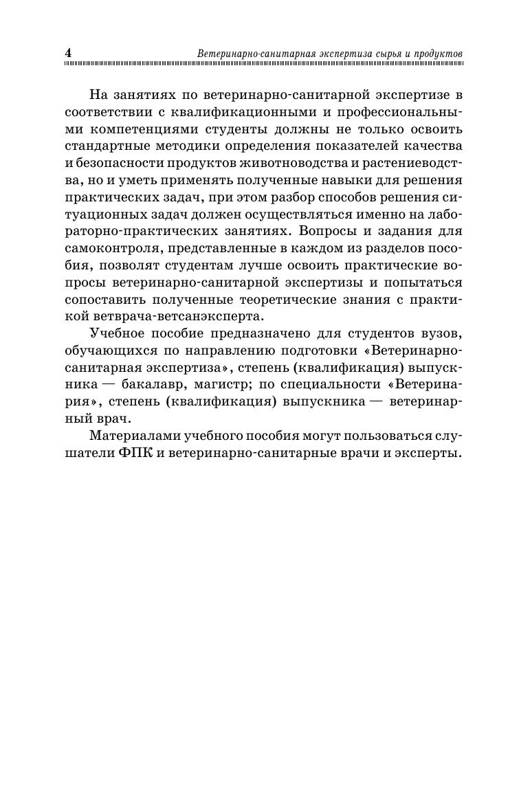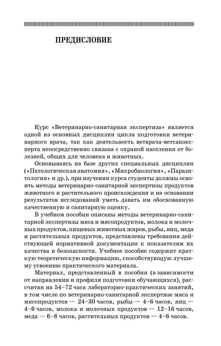 В лабораторном практикуме описаны методы ветеринарно-санитарной экспертизы мяса и мясопродуктов, молока и молочных продуктов, пищевых животных жиров, рыбы, яиц, меда и растительных продуктов, представлены требования действующей НТД к показателям их качества и безопасности. Учебное пособие содержит краткую теоретическую информацию, способствующую лучшему усвоению практического материала. Предназначено для студентов вузов, обучающихся по направлению подготовки "Ветеринарно-санитарная экспертиза", по специальности "Ветеринария". Материалами учебного пособия могут пользоваться слушатели ФПК и ветеринарно-санитарные врачи и эксперты.